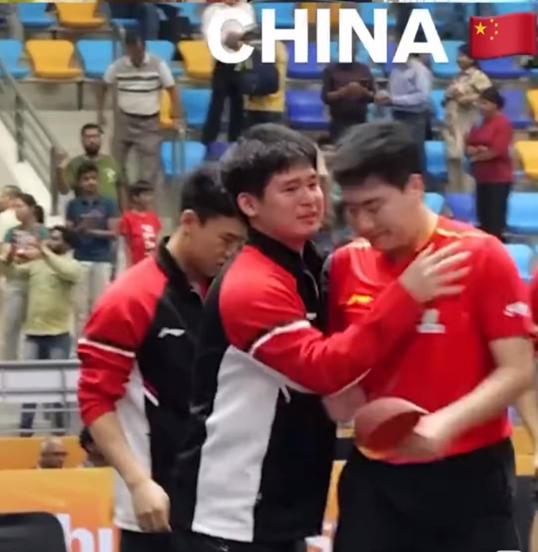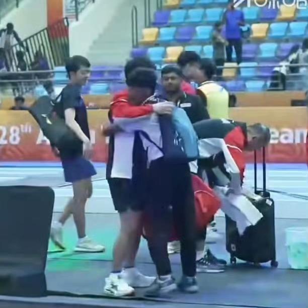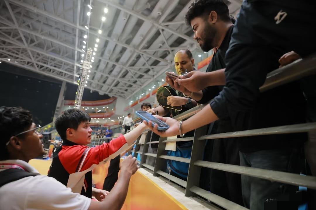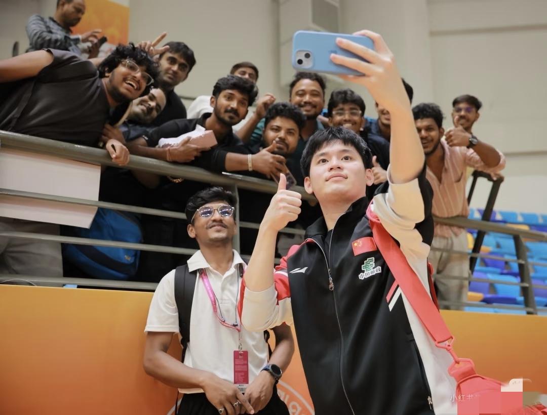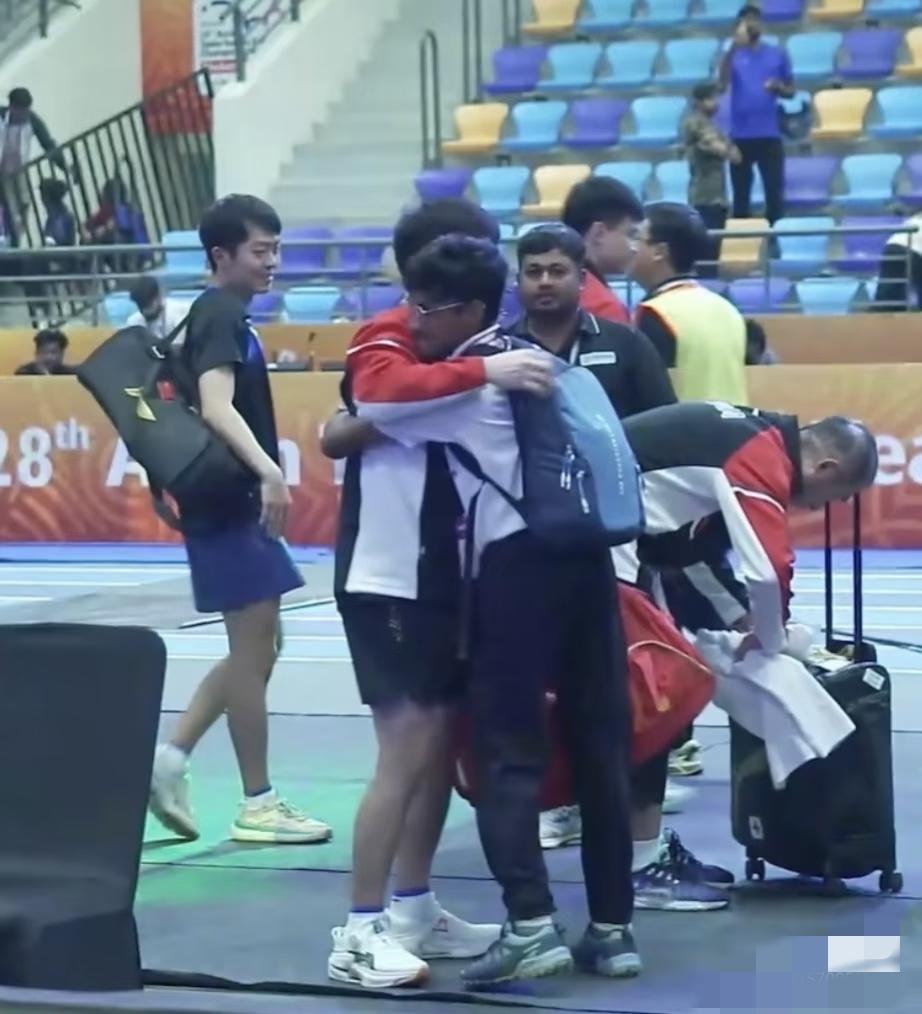 国乒男团半决赛后有趣的一幕, 大家都在收拾自己的东西, 有位印度的小孩哥在边上等着, 原来是在等林诗栋, 等石头收拾好了, 立马过来拥抱他, 估计当时石头可能得有点意外。 刚刚给王楚钦、梁靖崑鼓掌加油, 可能嗓子都喊废了, 激动的眼泪也留下了, 小孩哥过来拥抱也是对石头的崇拜加敬佩吧。