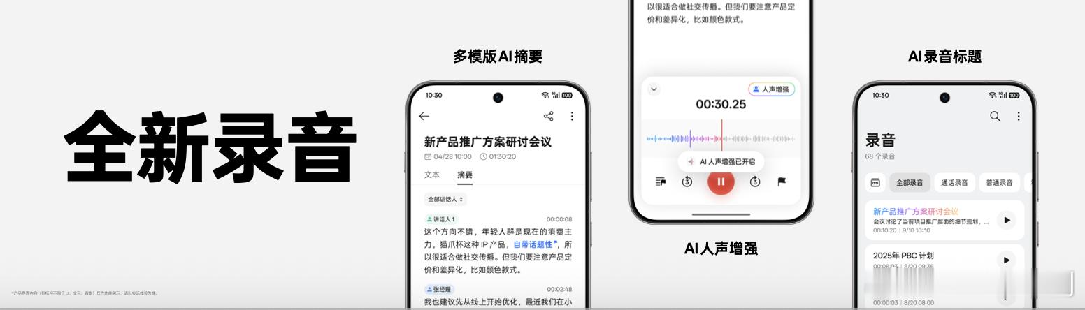 首先是全新录音,通过 AI 人声增强能力,可以让录音的人声更加清晰突出,AI 摘要也支持会议纪要、知识笔记等多种摘要模版,轻松摘出好文案并自动生成合适标题。