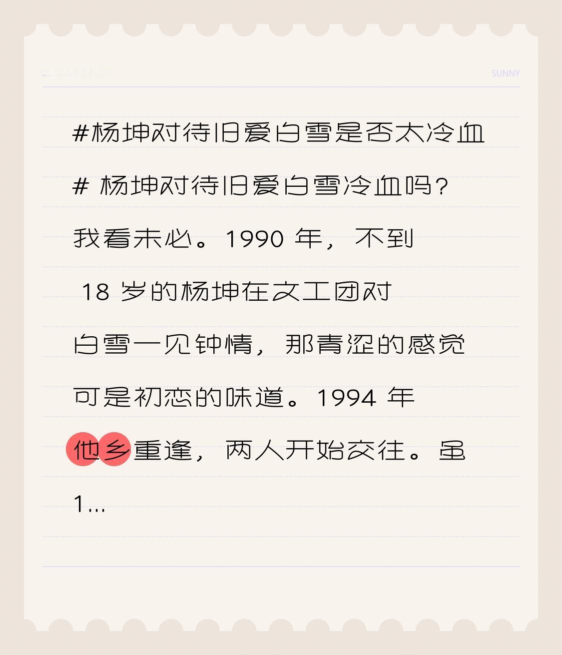 杨坤对待旧爱白雪冷血吗?我看未必。1990 年,不到 18 岁的杨坤在文工团对白雪一见钟情,那青涩的感觉可是初恋的味道。1994 年他乡重逢,两人开始交往。虽 1998 年分手,但杨坤一直难忘这段情。 近日他发新歌《爱河尽处》,透露是写给对他重要的人,封面的女舞者就是白雪。他还将在盛典演唱此歌纪念往昔。白雪已过世多年,杨坤 20 年后仍写歌怀念,这哪能算冷血,分明是深情难忘啊。