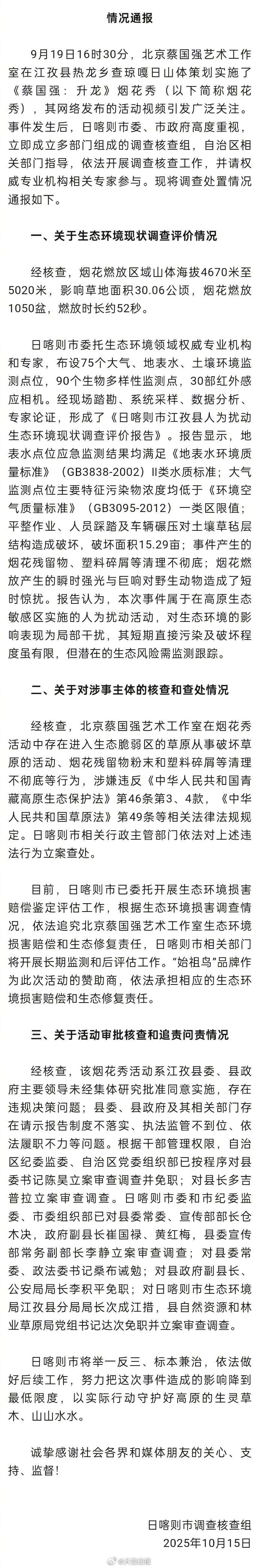 #蔡国强烟花秀调查情况#【#官方通报升龙烟花秀#】经核查,烟花燃放区域山体海拔4670米至5020米,影响草地面积30.06公顷,烟花燃放1050盆,燃放时长约52秒。报告显示,平整作业、人员踩踏及车辆碾压对土壤草毡层结构造成破坏,破坏面积15.29亩;事件产生的烟花残留物、塑料碎屑等清理不彻底;烟花燃放产生的瞬时强光与巨响对野生动物造成了短时惊扰。 (央视新闻)