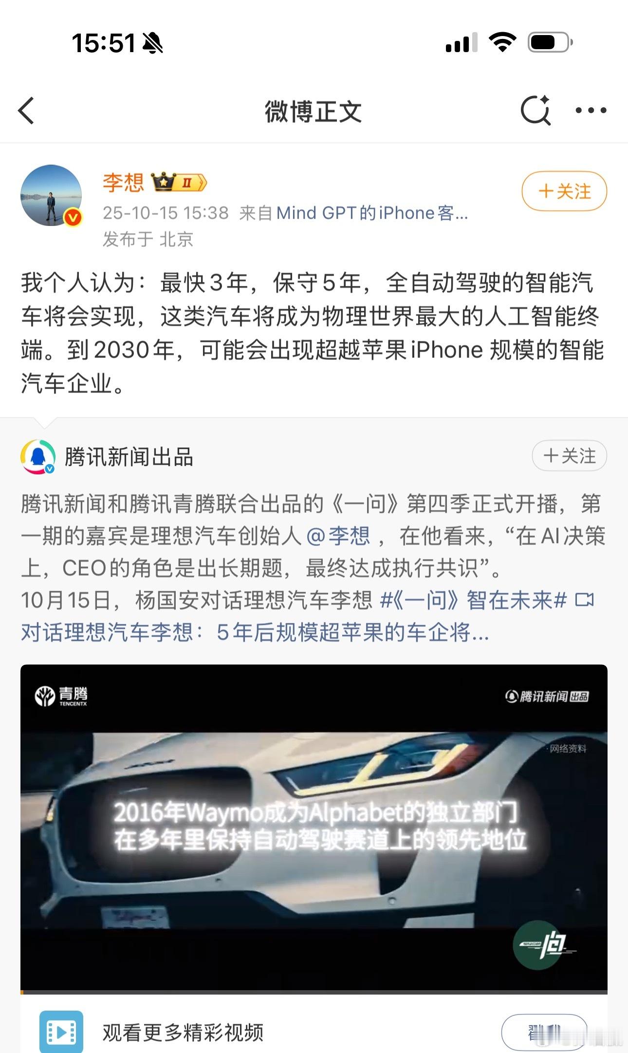 李想预言:3~5年内,全自动驾驶的智能汽车将会实现。