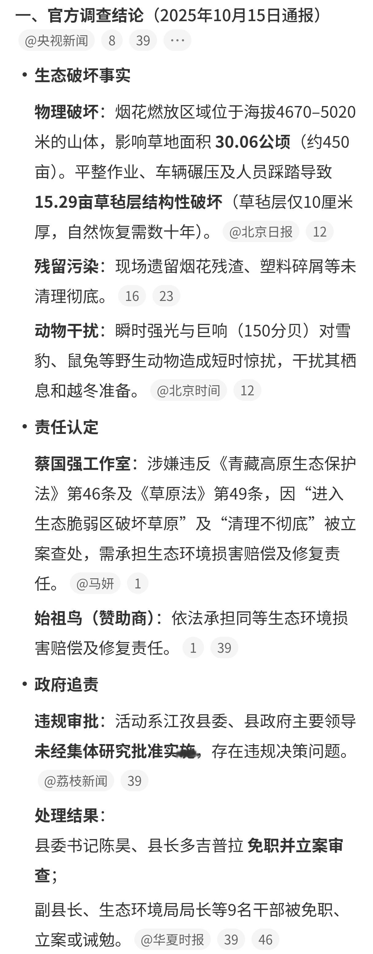 蔡国强烟花秀调查情况生态破坏是事实!影响草地30.06公顷,15.29亩草毡层结构性破坏,恢复需数十年!残留污染未清理彻底!对动物也造成了干扰!最开始的解释在真相面前成了借口,打着敬畏自然的口号做着破坏自然的事情!蔡国强和始祖鸟这次被钉在耻辱柱上了!始祖鸟承担相应赔偿修复责任