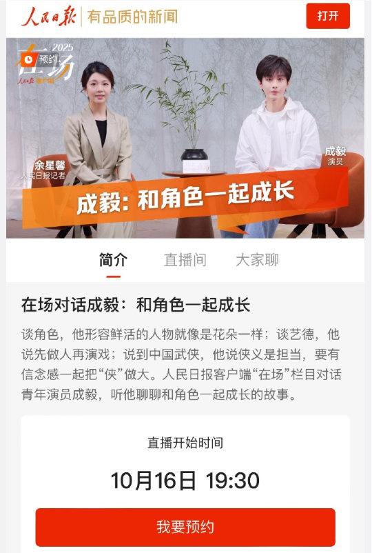 人民日报发了成毅的直播活动行程人民日报发了成毅的直播活动行程!正能量演员成毅[good][good][good]大家一起预约一下,明晚上直播见!