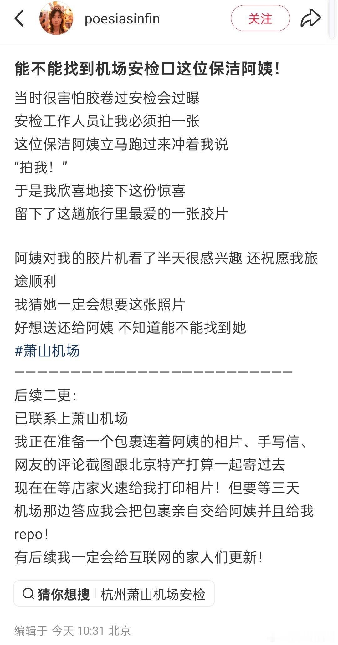 我上网就是为了看这些的,一位网友带着胶卷相机在萧山机场过安检,担心胶卷会过曝,所以必须要拍一张照片,一位保洁阿姨说拍我,照片洗出来以后,网友发帖寻人,萧山机场亲自出来认领,最终找到了阿姨,网友专门弄了相框和特产一起寄给了阿姨,看得人心里暖暖的萧山机场保洁阿姨
