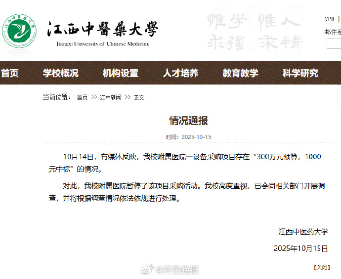 #300万预算1000元中标为何令人担忧#【晚报来论 | 300万元采购医疗设备1000元中标,为何令人担忧】一起“超低价中标”事件引发关注。近日,江西中医药大学附属医院公开招标,预算300万元,采购全自动生化免疫分析流水线设备。最终,江西某医药贸易有限公司中标,中标价仅1000元。10月15日,江西中医药大学针对此事发布情况通报称,已经暂停了该项目采购活动。