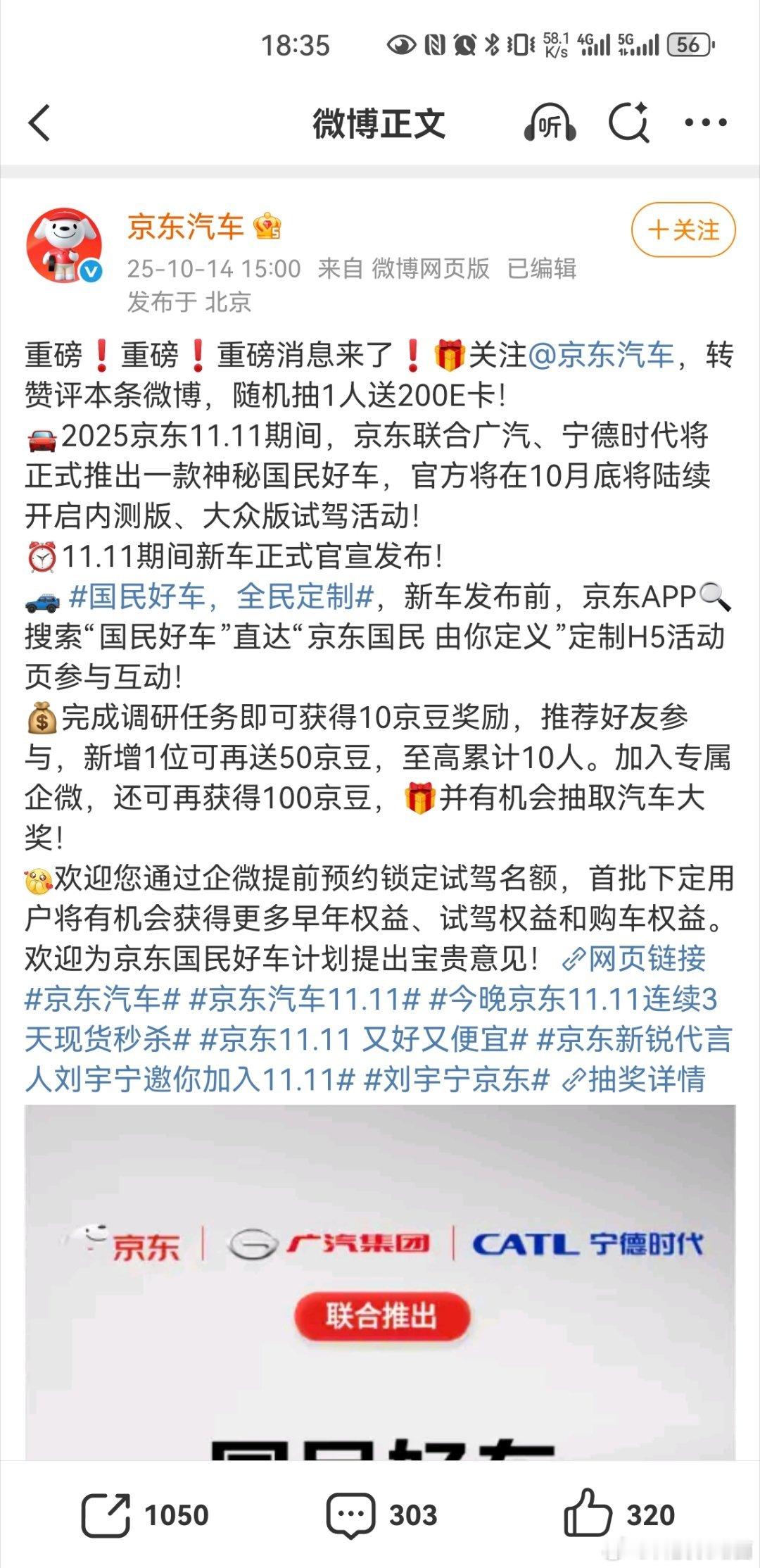 今天看到了 京东宣布要广汽以及宁德时代合作推出汽车了。京东并非像小米、百度那样亲自涉足汽车制造,而是选择了一条更轻资产的路径:以“用户洞察+独家销售”的角色,联合广汽集团和宁德时代,共同推出一款“国民好车”, 这本质上是一场汽车消费模式的革新实验,至于这一条路能不能走通,让我们拭目以待。京东造车