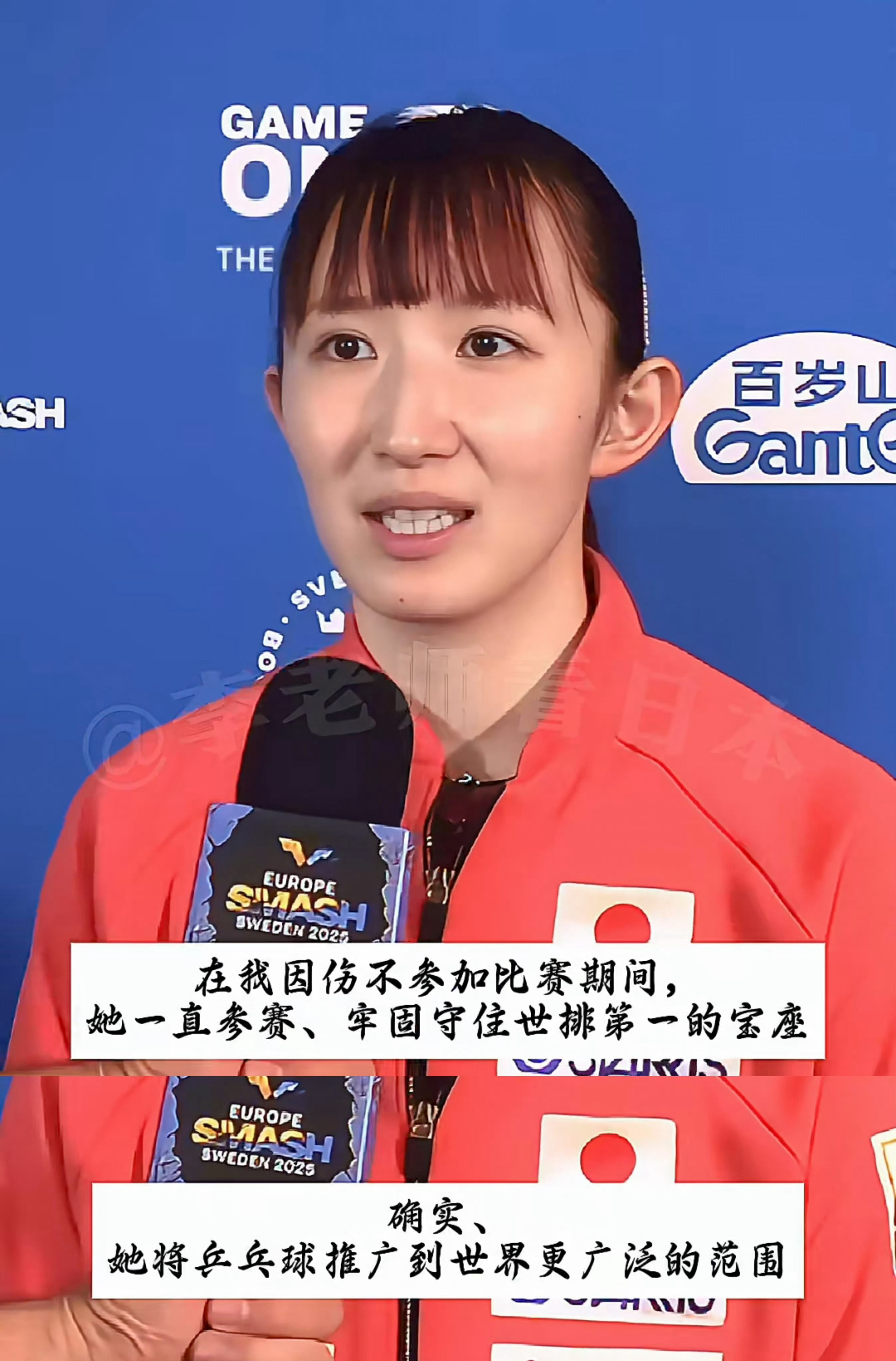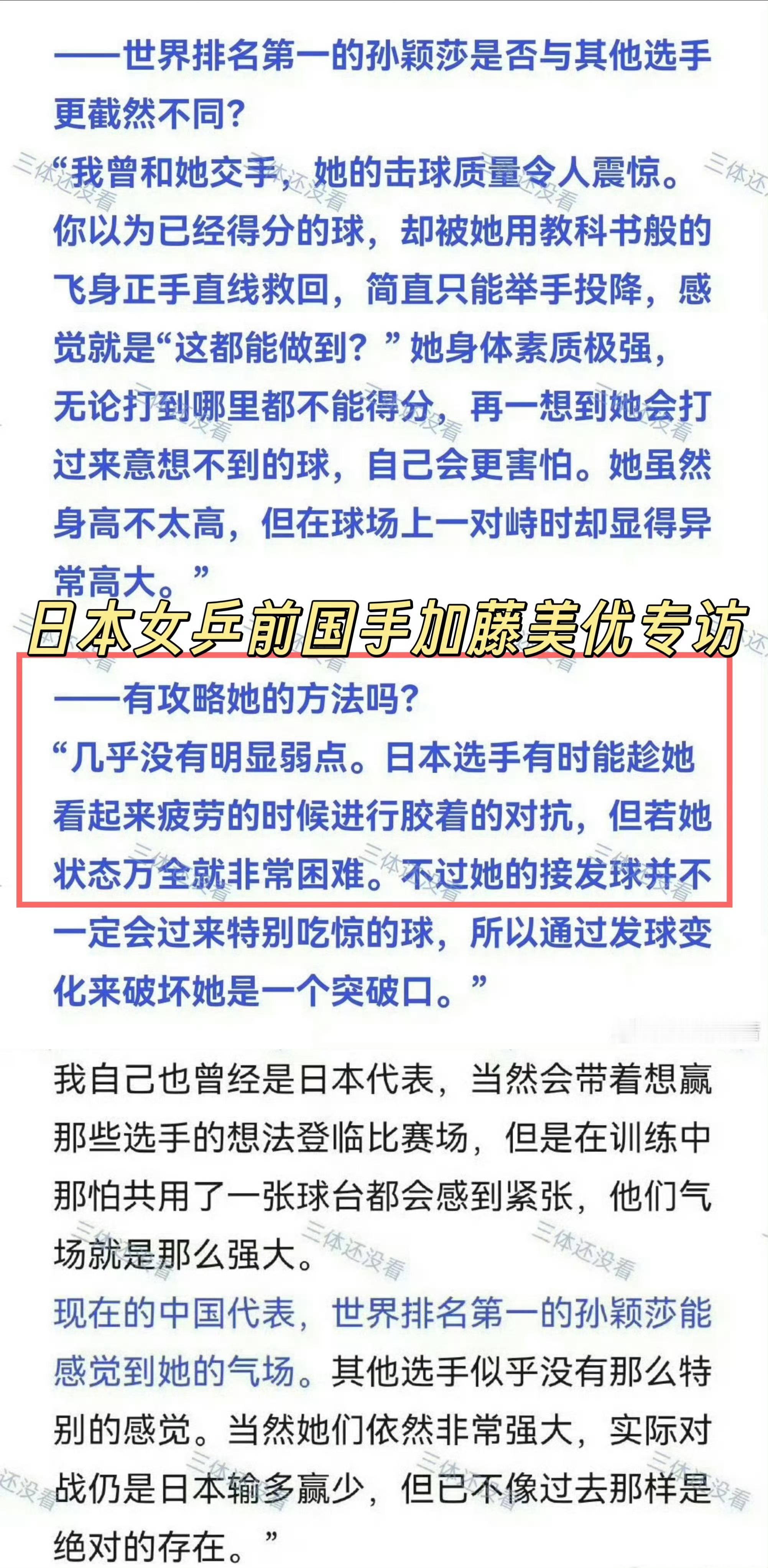 日本一姐早田希娜前不久采访提到【在因伤不参加比赛期间,孙颖莎一直参赛,牢固守住世排第一的宝座。】日本前国手加藤美优专访提到【孙颖莎几乎没有明显弱点,日本选手有时能趁她看起来疲劳的时候进行胶着的对抗,但若她状态万全就非常困难。】