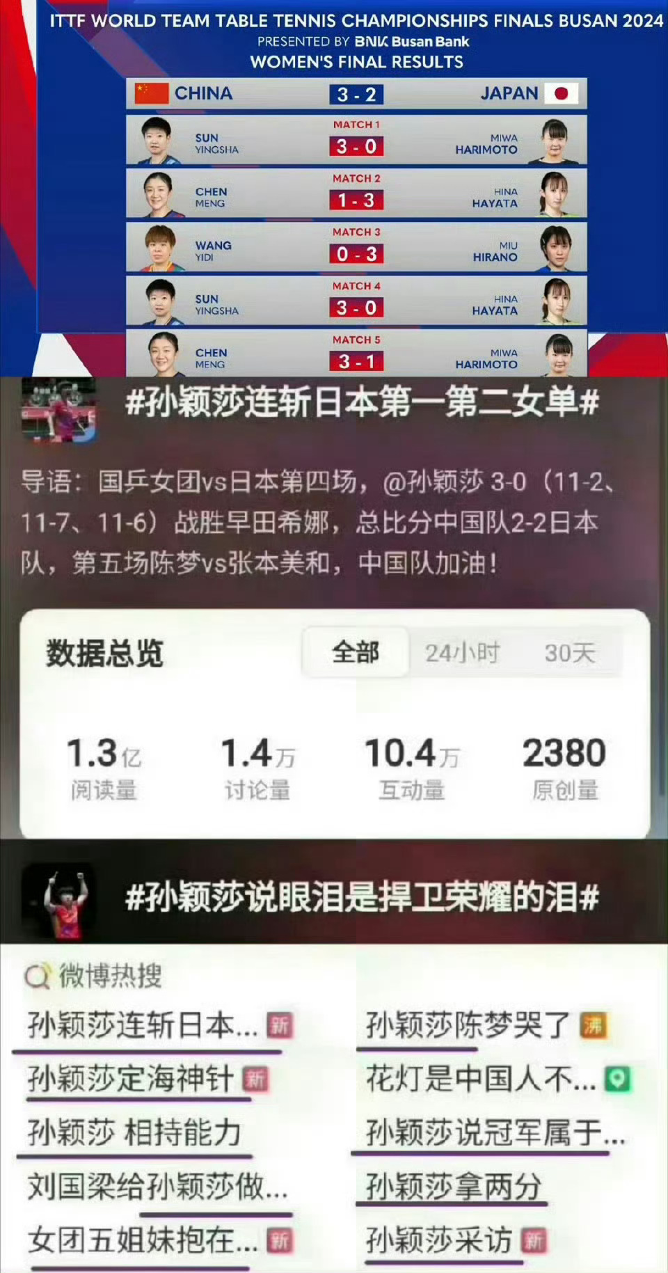 2024年釜山世乒赛团体决赛,孙颖莎拿到第一分后两个队友连续失利,孙颖莎重压之下力顶千钧一单独得两分,两个霸气的3比0零封连斩日本一单二单。这是20世纪以来中国女团第一次在1:2落后的情况下反败为胜。