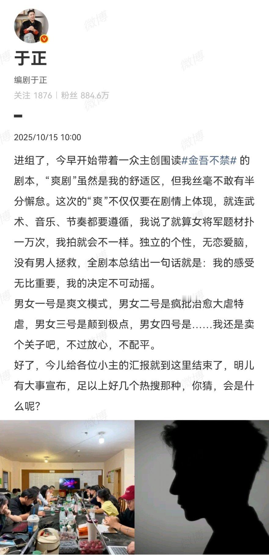 夏之光签约新公司 于正这剧透太会吊胃口了!说“明天有大事”,晒出的侧颜剪影与夏之光99%吻合!之前就传夏之光哇唧唧哇到期要签欢娱,离开龙丹妮的哇唧唧哇去于正的欢娱,蹲一个明天的大消息,期待夏之光的新公司和新发展![打call][打call][打call]
