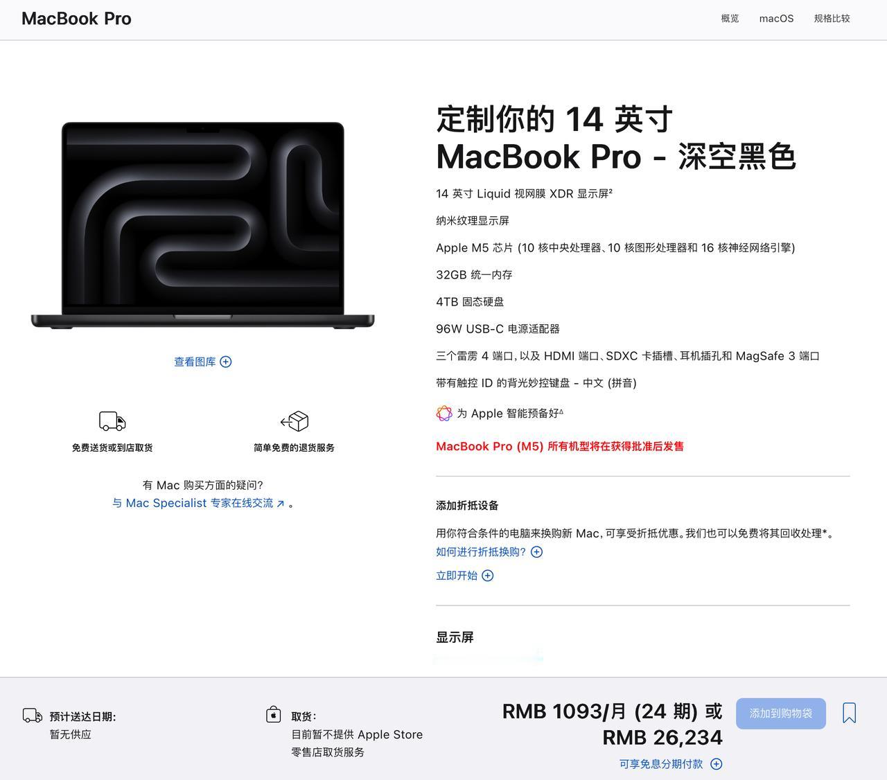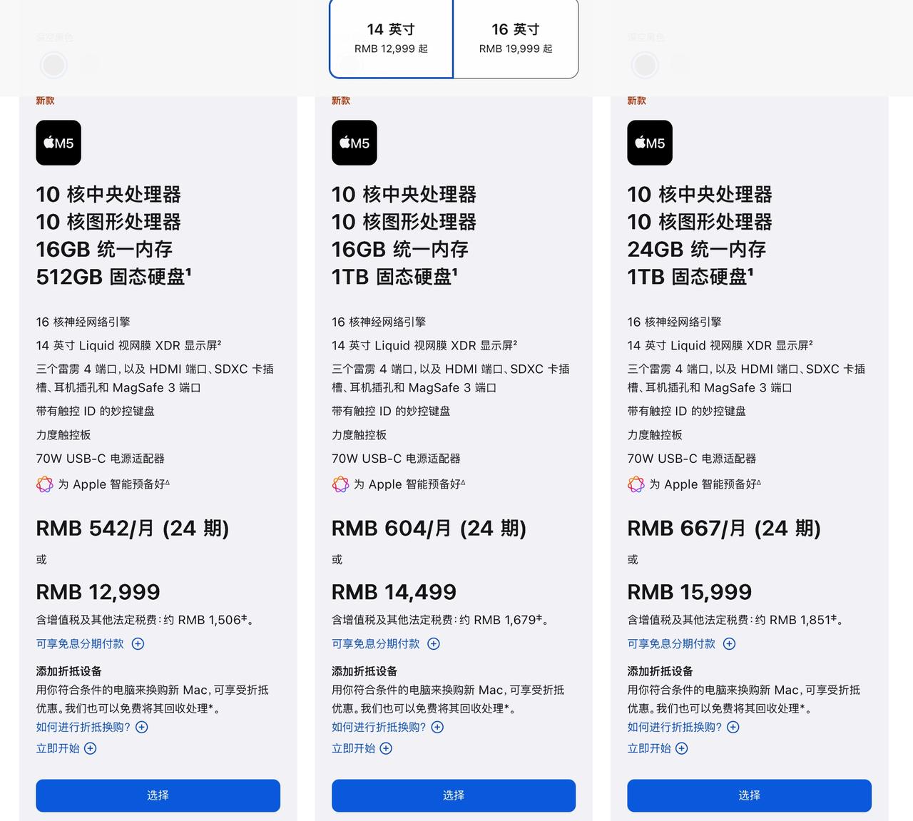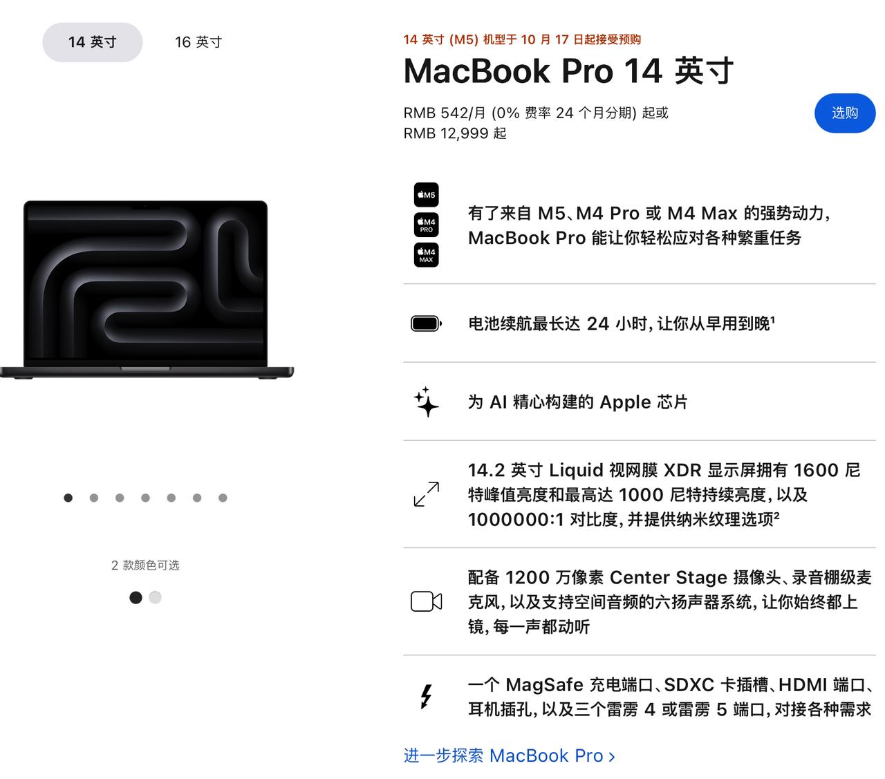 苹果公司发布M5芯片版14英寸MacBook Pro 16+512GB售价12999元起步 16+1TB售价14499元起步 24GB+1TB售价15999元起步 32GB+4TB+纳米纹理显示屏幕+96W充电器售价26234元