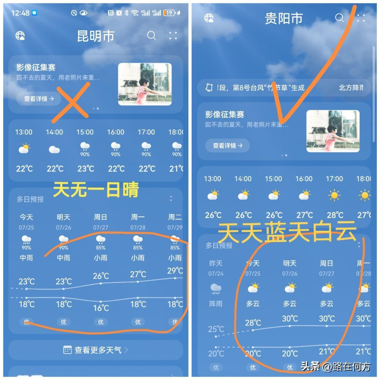 云南网友的天塌了! 7~10月天无一日晴的昆明,7~10月几乎天天晴的贵阳!10月中旬依然短袖短裤的贵阳,10月中旬已脱不掉外套的昆明。 云南人出口则是贵州天无三日晴,可如今昆明成了天无一日啨,这可如何是好,没有素材了[呲牙][呲牙][呲牙]