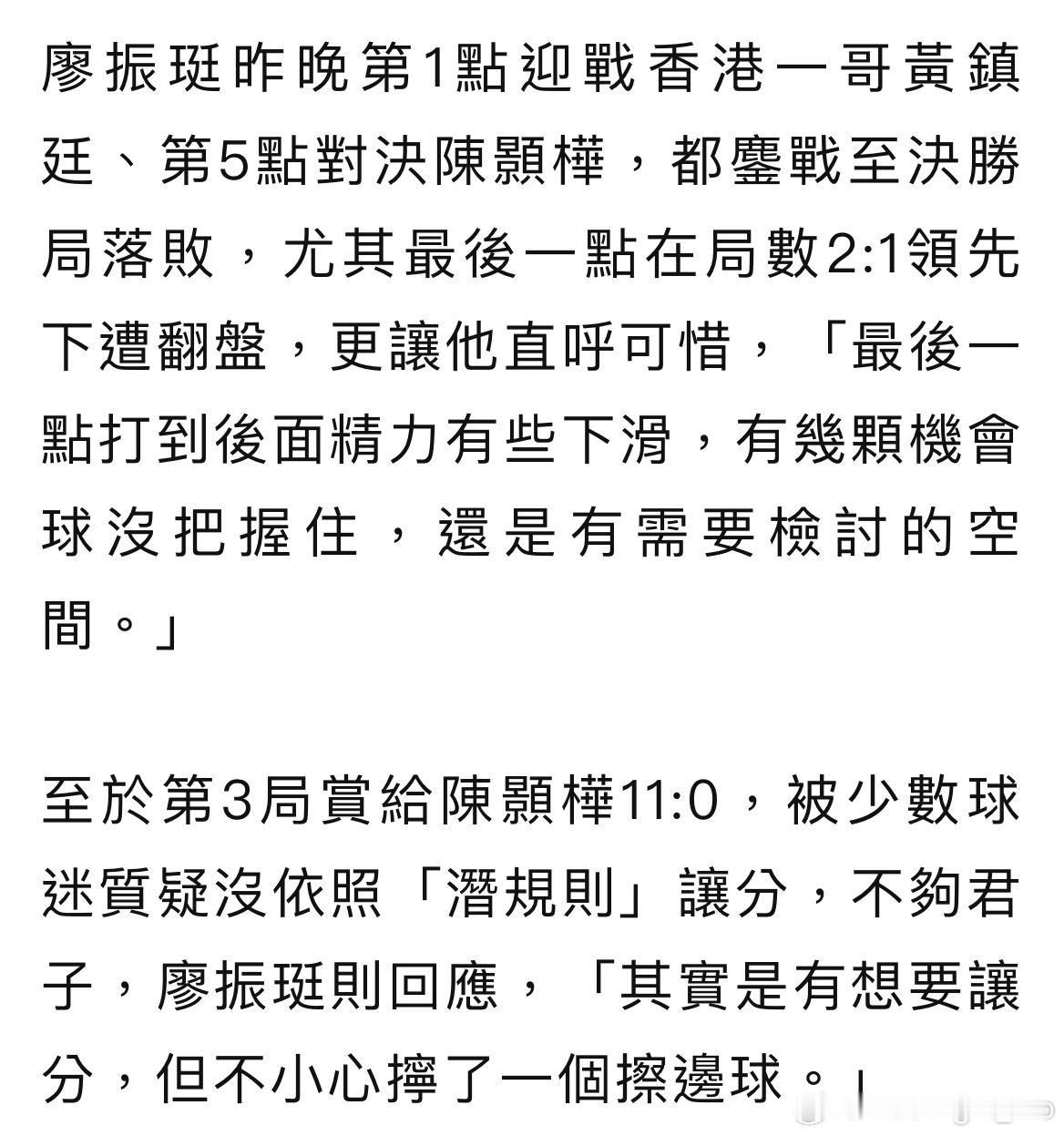 至于第3局赏给陈颢桦11:0,被少数球迷质疑没依照「潜规则」让分,不够君子,廖振珽则回应,「其实是有想要让分,但不小心拧了一个擦边球。」