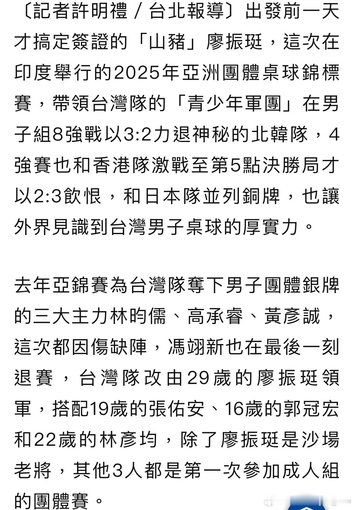 【台媒】廖振珽在对朝鲜之战,在第1点和第5点分别击退李正植、咸有成,扮演夺牌的头号功臣,但他并不居功,也盛赞3名小将都发挥得很出色,打出国际竞争力,「这次团队的氛围相当棒,不管谁在场下,都尽全力帮场上的队友加油!」