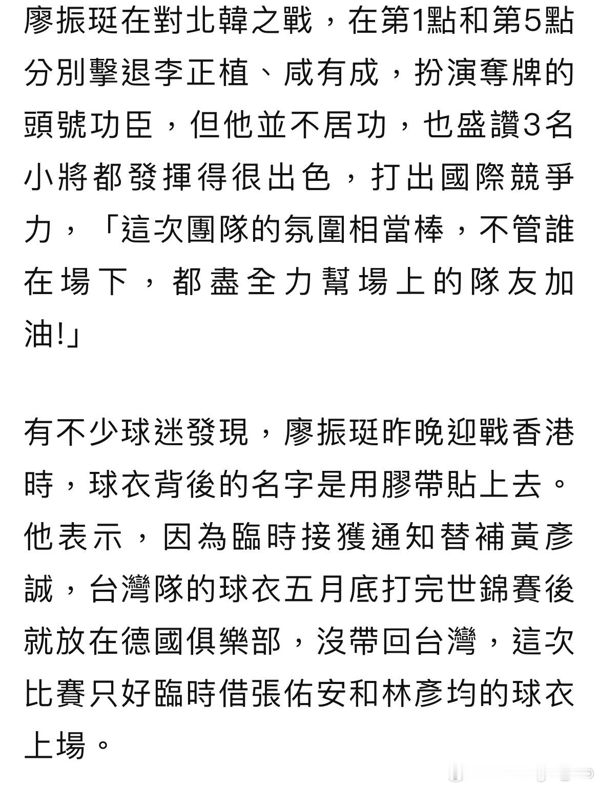 有不少球迷发现,廖振珽昨晚迎战香港时,球衣背后的名字是用胶带贴上去。他表示,因为临时接获通知替补黄彦诚,球衣五月底打完世锦赛后就放在德国俱乐部,没带回台湾,这次比赛只好临时借张佑安和林彦均的球衣上场。