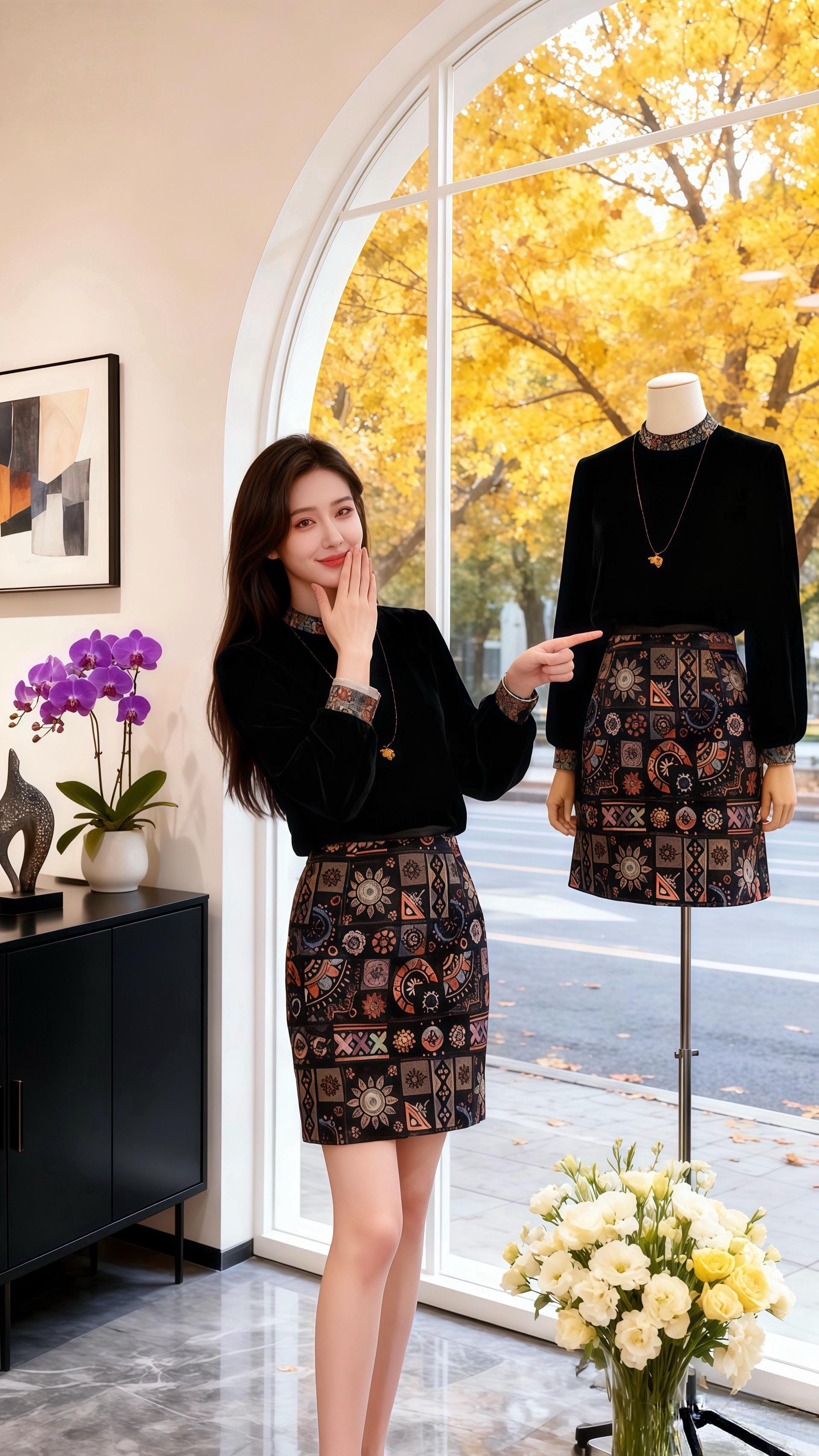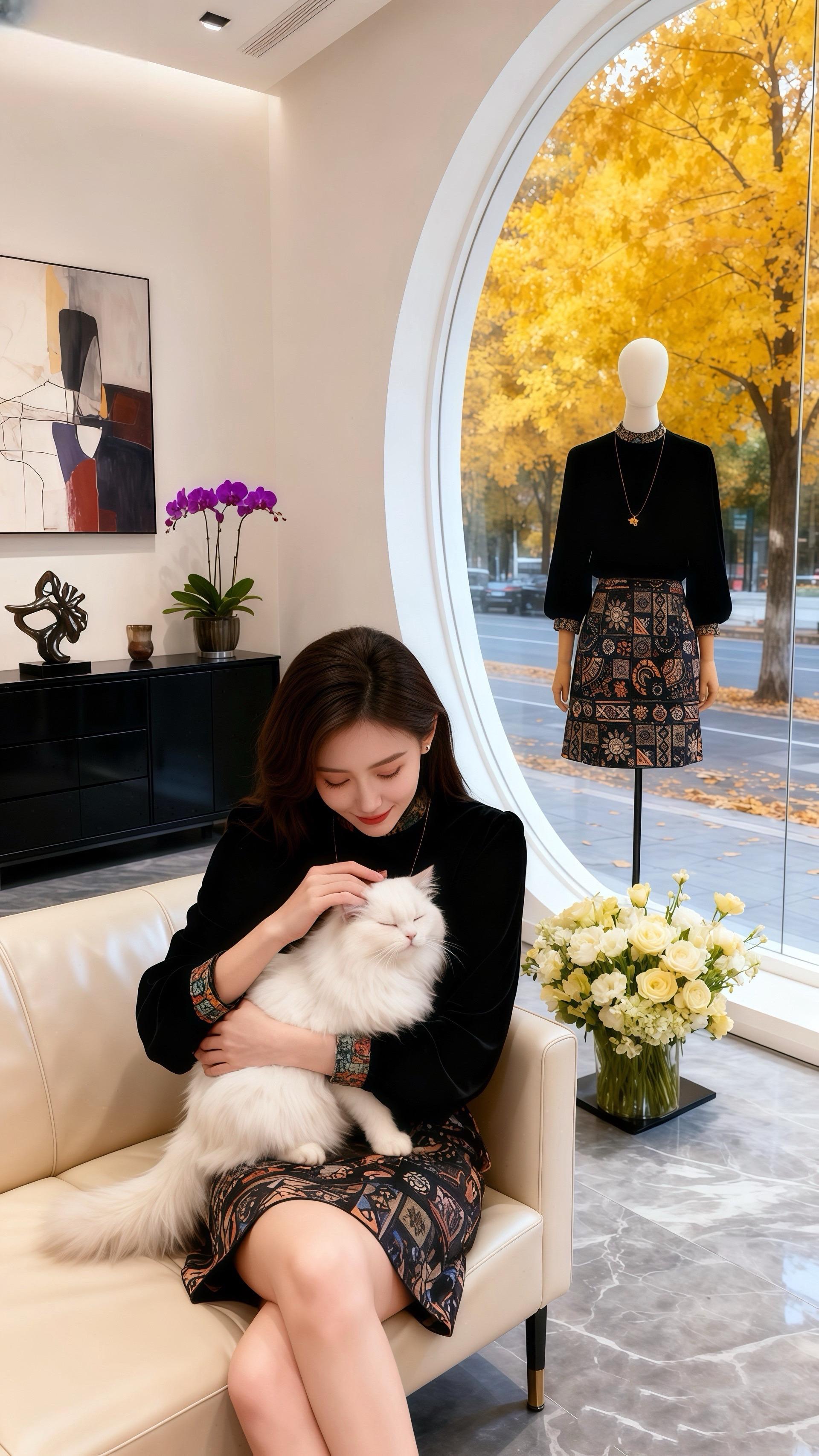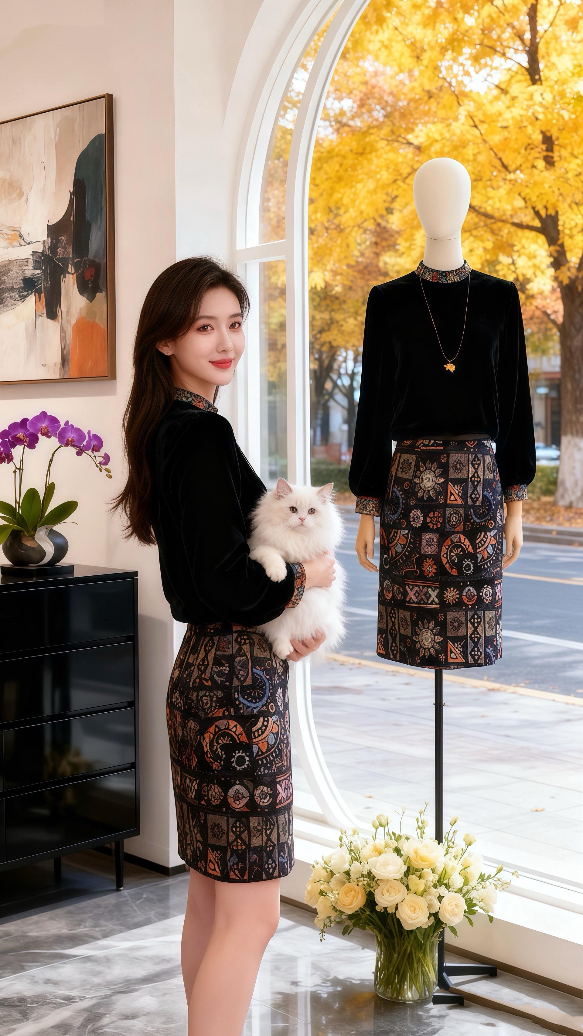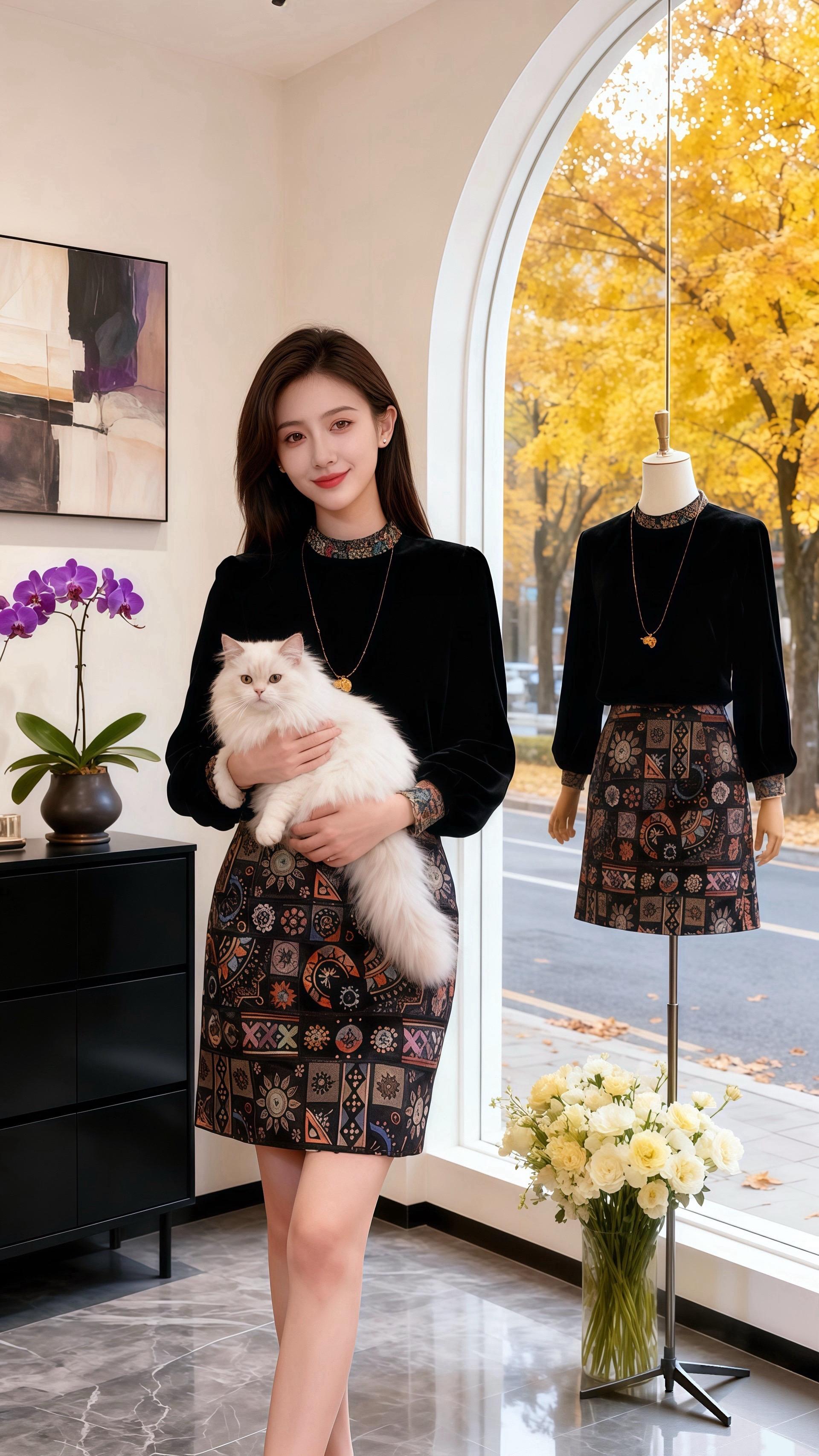 秋日的午后,阳光透过女装店弧形的落地窗,给室内镀上一层暖黄。许妍抱着那只雪白的长毛猫,指尖轻轻拂过它柔软的毛发,小猫惬意地眯起眼。 “你今天这身搭配,很出彩。”皓明的声音温柔响起,他目光落在许妍身上,黑色丝绒上衣衬得她肌肤胜雪,印花半裙又添了几分复古韵味,“领口和袖口的细节,还有这条裙子的图案,衬得你特别有气质。” 许妍脸颊微红,低头逗弄着怀里的猫:“就你会说。” 皓明走近,视线掠过旁边人体模特身上的同款套装,又落回她身上:“是真的。你总能把衣服穿出独特的味道,既优雅又有活力。” 窗外金黄的树叶沙沙