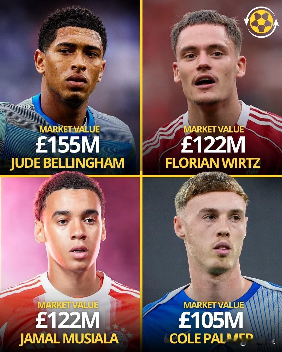 🤔 请将这四名攻击型中场按1-4名排序: 🔸 贝林厄姆 — 1.55亿英镑 -皇家马德里 | 22岁 | 攻击型中场 🔸 维尔茨 — 1.22亿英镑 -利物浦 | 22岁 | 攻击型中场 🔸 穆西亚拉 — 1.22亿英镑 -拜仁慕尼黑 | 22岁 | 攻击型中场 🔸 帕尔默 — 1.05亿英镑 -切尔西 | 23岁 | 攻击型中场 (市场价值来源:@Transfermarkt)