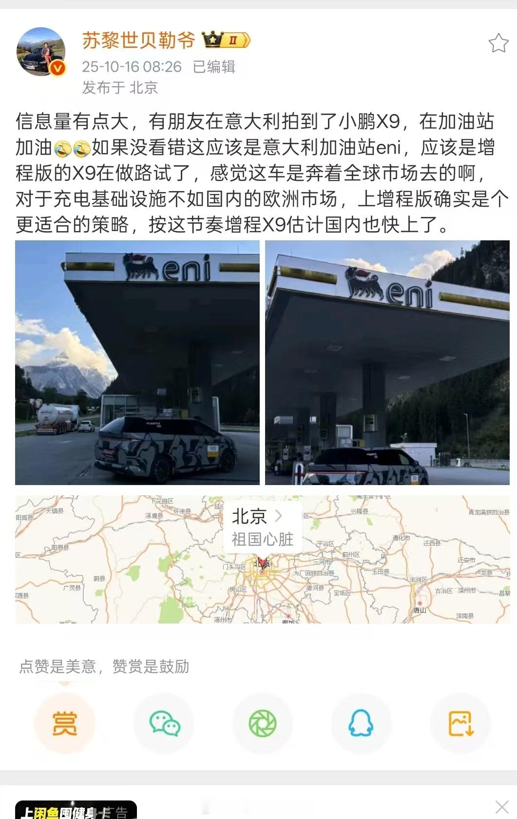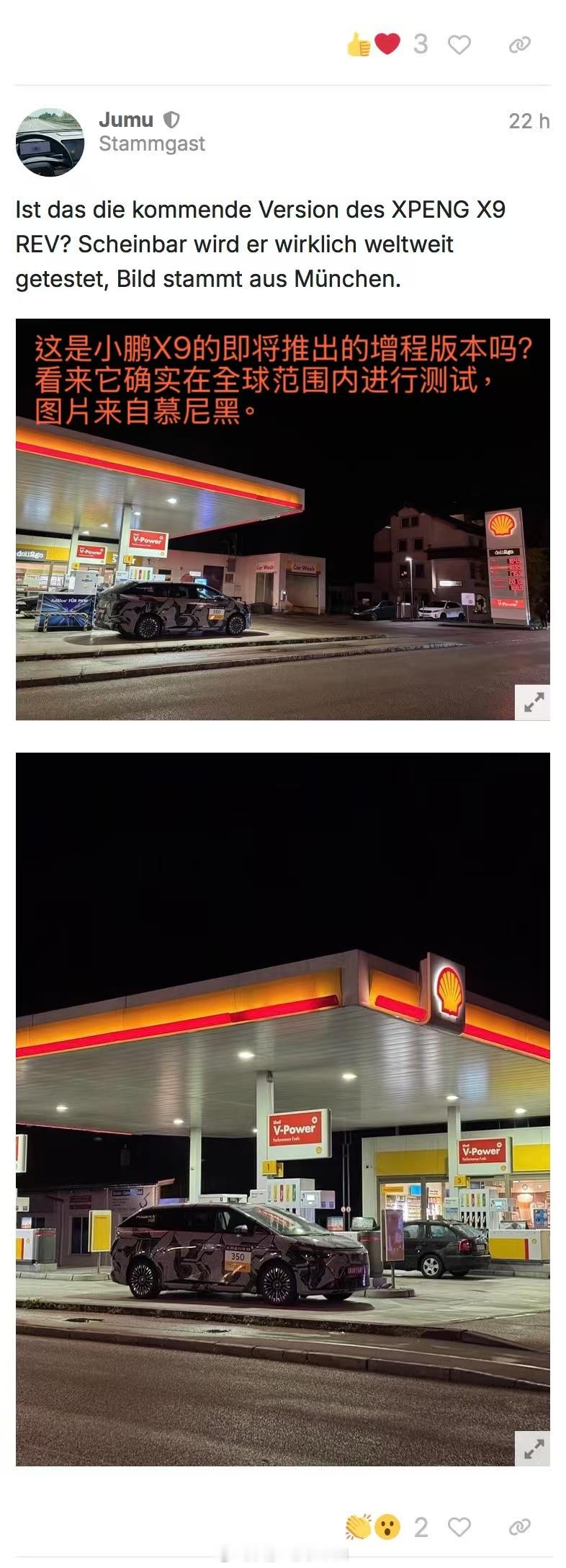 如无意外小鹏这个车肯定会在欧洲上市,对于充电设施没那么好的欧洲来说,确实增程是个更好的选择。新款小鹏X9在德国加油站被拍
