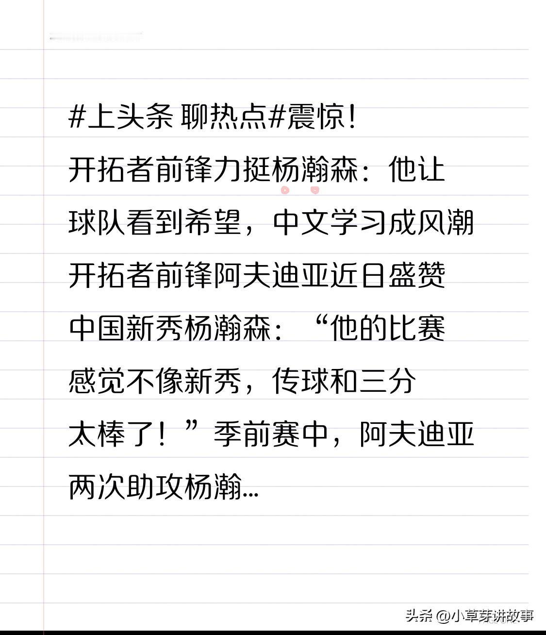 震惊!开拓者前锋力挺杨瀚森:他让球队看到希望,中文学习成风潮 开拓者前锋阿夫迪亚近日盛赞中国新秀杨瀚森:“他的比赛感觉不像新秀,传球和三分太棒了!”季前赛中,阿夫迪亚两次助攻杨瀚森命中三分,助其砍下16分创生涯新高。更衣室内,利拉德、阿夫迪亚主动学中文,只为与杨瀚森更好沟通。开拓者从上到下力挺,杨瀚森正用实力证明自己。网友热议:“这融入速度,未来可期!”