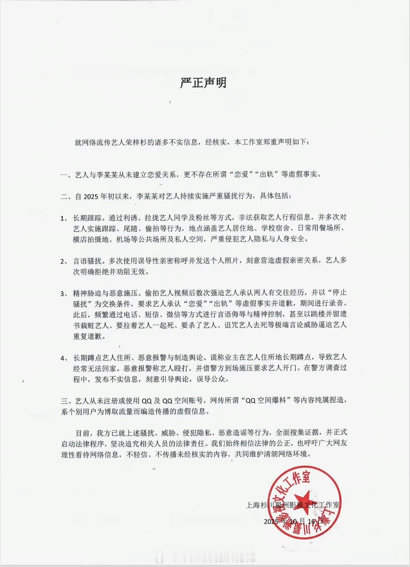 荣梓杉方称与李禹熹从未建立恋爱关系荣梓杉称被李禹熹持续骚扰