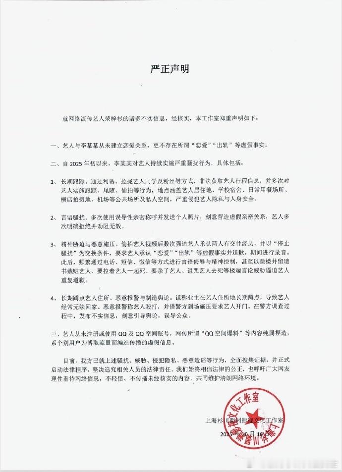荣梓杉工作室发声明否认恋爱出轨荣梓杉工作室称恋爱出轨是不实信息荣梓杉 李禹熹传闻发酵后,荣梓杉工作室亮明态度,否认恋爱与出轨说法,驳斥不实内容。