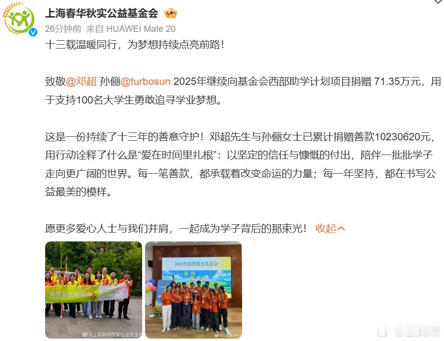 邓超孙俪为助学捐赠累计上千万邓超孙俪13年为助学捐赠上千万[抱抱]