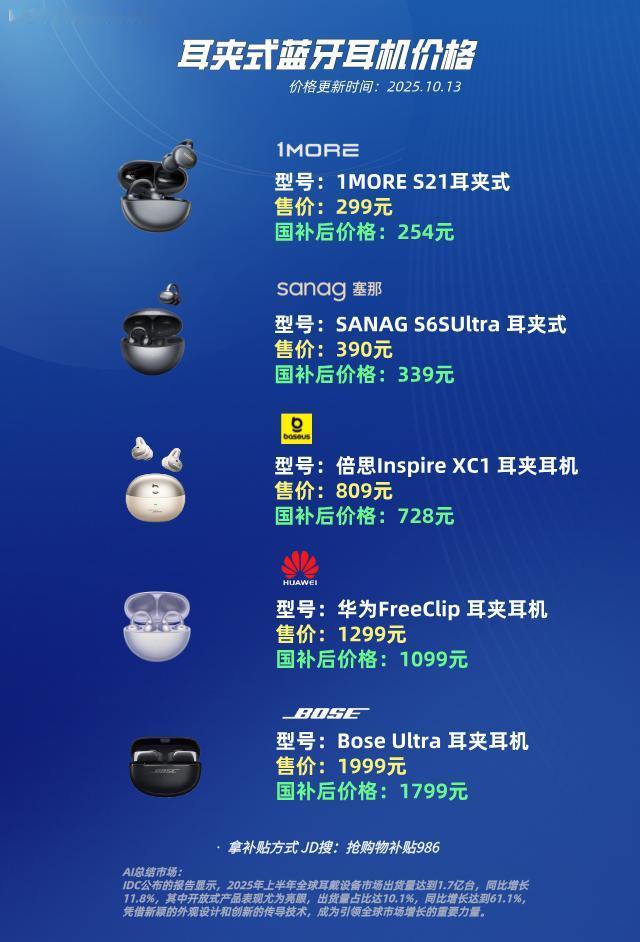 耳夹耳机价格 1MORE S21(254) 塞那S65Ultra(339) 倍思InspireXC1(728) 华为FreeClip(1099) BoseUltra(1799) 拿补贴方式 JD搜:抢购物补贴986 2025年开放式耳机出货量激增,当中的耳夹耳机增长最为明显。 受欢迎的原因:不入耳设计、时尚新潮、适合运动场景…… 蓝牙耳机 倍思BC1/AS01开放式蓝牙耳机不入耳长续航智慧双连运动跑步耳夹式
