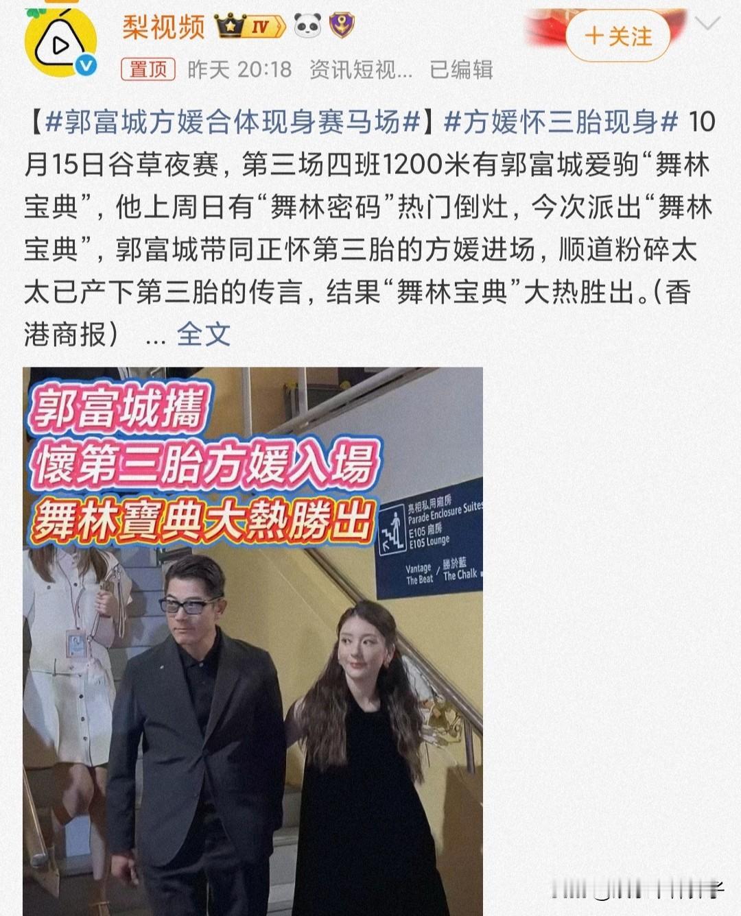 郭富城这心可真大,方媛都快生了,还带老婆去赛马场秀恩爱! 10月15日,据媒体报道,郭富城带着正怀三胎的方媛现身赛马场,最后爱驹大热胜出,并晒出一段视频。 画面中,方媛手里拿着香槟,郭富城用手抚摸老婆的孕肚,夫妻二人深情对视,这波狗粮让人猝不及防,真是夫唱妇随啊! 咱就说,网上看到消息,方媛已经预产期已经临近,按理说,应该在家安心待产,没必要出来如此劳顿,更何况来回还要下楼梯,郭富城这心可真大呀! 要是为了辟谣网上传言,完全没必要,方媛之前已经否认产下第三胎,秀恩爱也不急于一时,沾沾喜气,倒是可以理解。 另外,看方媛现在的状态,孕肚确实不小,可面容依旧精致,真的一点看不出来快要待产的样子,貌似怀孕八九个月,脸上多少有点浮肿的迹象,可能每个人的体质不同吧! 估计郭富城心里都乐开花了,这个年纪又要当爸爸了,如果方媛生个儿子,那就儿女双全,真的完美了!