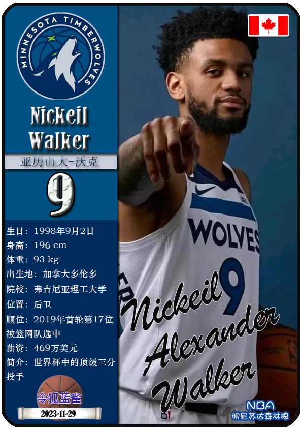 森林狼.亚历山大-沃克(场均9.4分3.2板2.7助)