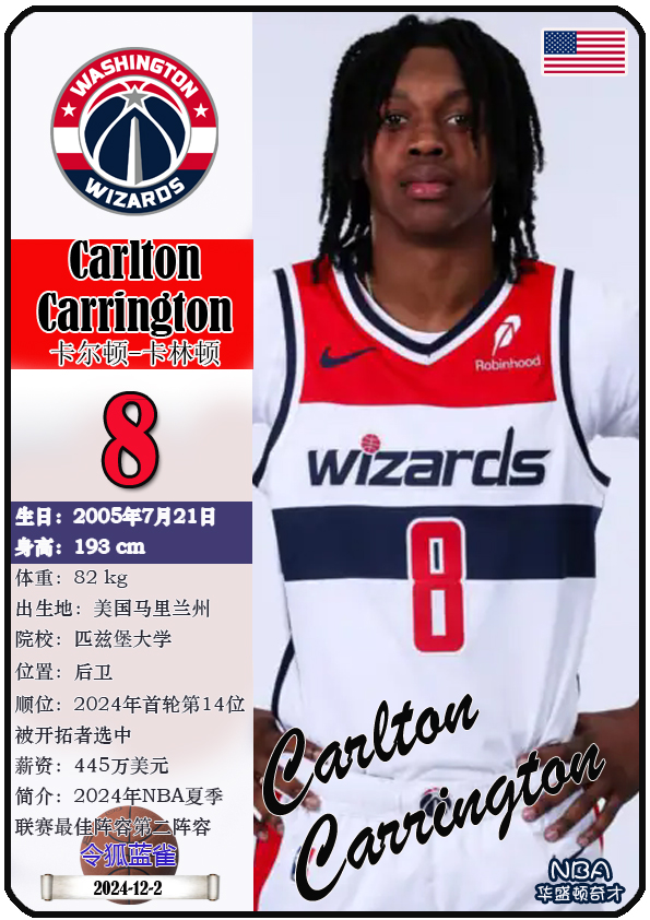 奇才.卡尔顿-卡林顿(场均9.8分4.2板4.4助)
