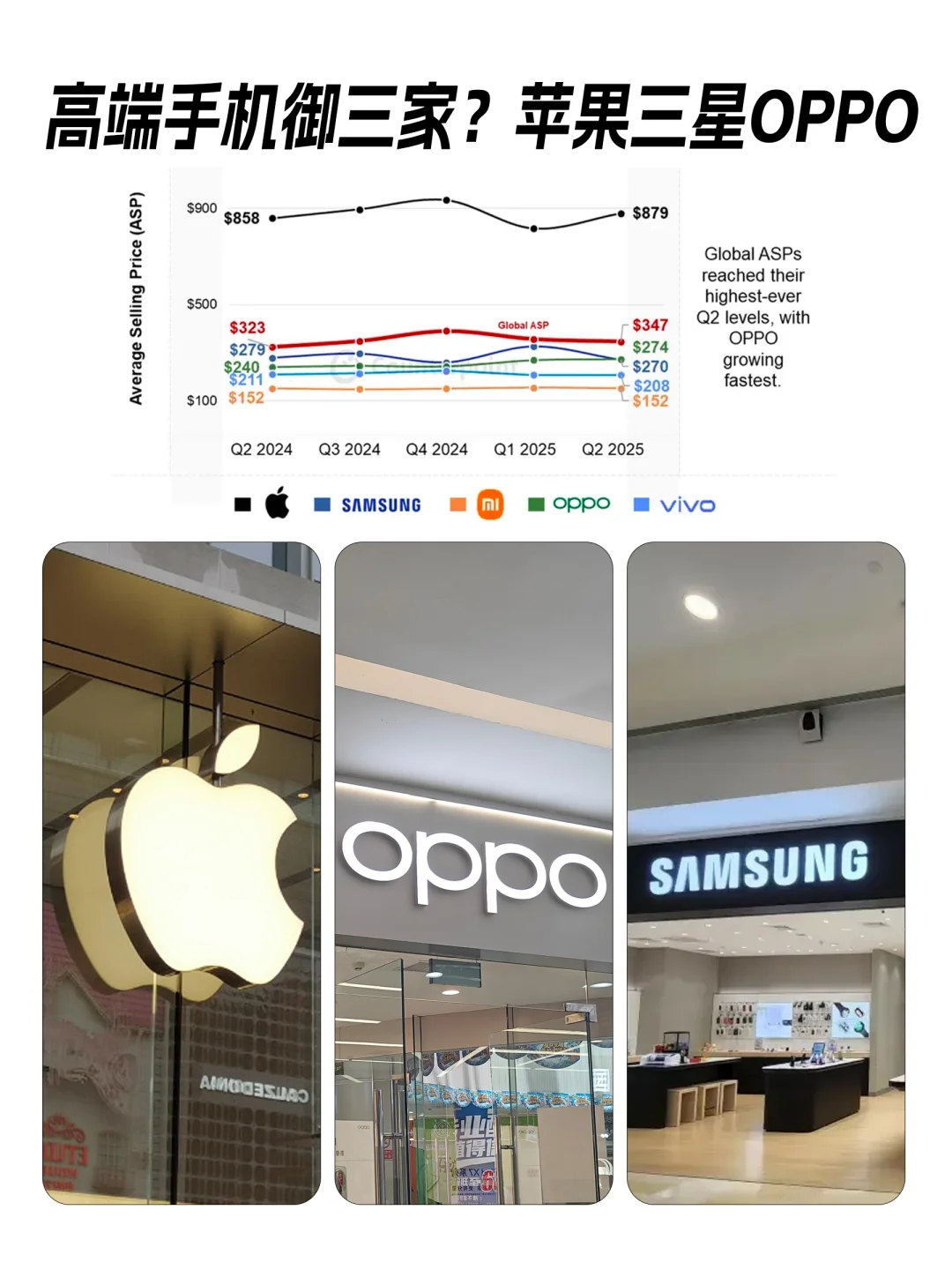 说点很多人不知道的:2025年只有苹果、三星、OPPO的全球平均售价(ASP)超过 250 美元(来自Counterpoint数据),其中OPPO以274美金的ASP超越三星位列全球第2! 翻译成人话就是,ASP是衡量手机厂商健康程度的一个重要指标,ASP不足,利润模型不健康,很难支撑长期研发投入,正因如此👇 那再说一个冷知识:OPPO连续五年专利申请量位列全球前10!个人觉得目前高端手机代表应该是:苹果三星OPPO御三家。你赞成吗?
