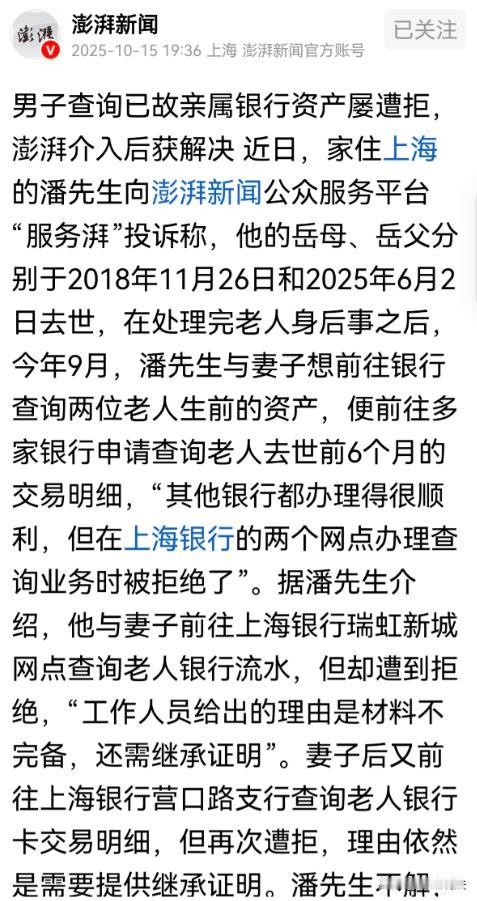 上海,潘先生的岳父母先后去世,处理完后事,潘先生和妻子去多家银行查老人的资产,因为不知道岳父母存在哪家银行,只能去多家银行查询,前面几家银行都很配合,到了某家银行时却被拒绝,银行要求出示继承证明,否则不能给查。潘先生认为妻子是第一顺序继承人,材料也都齐全,其他银行都能给查,为什么这家银行不给查,潘先生认为这是在故意刁难自己。 潘先生最近被一件烦心的事搅得很乱,2018年11月26日,潘先生的岳母因 病离开了人世,潘先生和妻子一起操办好了岳母的后事。 2025年6月2日,岳父也撒手人寰,接连失去双亲,这对潘先生夫妻来说,这种打击不小。 在处理好岳父的后事之后,潘先生想到岳父母一生节俭,很可能有不少存款,可他们并不清楚具体存在哪家银行,也不知道存了多少。 于是,潘先生决定和妻子一起去各家银行查一下岳父生前6个月的银行流水,希望能理清这笔遗产的情况。 他们先去了几家银行,很顺利,柜员在查看了他们提供的材料后,很快就为他们办理了查询业务。 潘先生夫妻心里稍感安慰,觉得事情应该能很快解决。 然而,当他们来到某银行时,潘先生将准备好的材料递给柜员后,柜员只是匆匆扫了一眼,便皱起了眉头,说他们出具的材料不完备,必须要提供继承证明才能查询。 潘先生赶忙解释道,妻子是岳父母的女儿,按照法律规定,属于第一顺序继承人,而且他们带来的死 亡 证明、亲属关系证明等材料都是齐全的。 前面几家银行都没有要求提供继承证明,怎么到了这家银行就不行了呢? 柜员听后,却不为所动,坚持称这是银行的规定,没有继承证明就不能查询。 潘先生觉得银行就是在故意刁难自己,他打发妻子去了这家银行的另一个网点,想着或许能碰碰运气。 可结果却让他大失所望,妻子在那个网点同样遭到了拒绝。 潘先生觉得银行的做法,实在是太不合理了。他质问柜员为什么要设置这样的障碍,难道就不能从客户的角度考虑一下吗? 柜员的态度依旧强硬,表示他们有严格的规定,查询去世老人资产必须出具继承证明,如果潘先生不服,可以去仲裁或者起诉。 潘先生真没想到一件原本简单的事情,会变得如此复杂。 潘先生也咨询了很多人,也查阅了不少资料,可银行就是咬着规定不放。 有人觉得银行的规定太死板,没有考虑到实际情况,应该灵活处理。 也有人认为银行这样做是为了保障客户的权益,避免出现遗产纠纷,是合理的。 就在潘先生感到绝望的时候,事情出现了转机,在10月13日,潘先生终于办理了业务,查询到了岳父的银行流水。 原来,岳父在几家不同的银行都有存款,虽然金额不算特别巨大,但也是一笔不小的数目。 那么,银行拒绝为潘先生查询去世岳父的资产,潘先生认为银行故意刁难,双方就查询资产所需材料产生了较大的分歧,以法律角度该如何看这事? 1,银行要求继承证明是否违反法律规定呢?银行以内部规定为由,要求提供继承证明才允许查询去世老人资产,这种做法是否合规? 依据民法典第一千一百二十七条规定,遗产按照下列顺序继承,第一顺序为配偶、子女、父母。潘先生妻子作为岳父母的女儿,属于第一顺序继承人。 同时,根据商业银行法第二十九条规定,商业银行办理个人储蓄存款业务,应当遵循存款自愿、取款自由、存款有息、为存款人保密的原则。对个人储蓄存款,商业银行有权拒绝任何单位或者个人查询、冻结、扣划,但法律另有规定的除外。 而且,根据2024年6月1日实施的《金融监督管理总局 人民银行关于优化已故存款人小额存款提取有关要求的通知》第四条规定:已故存款人的第一顺序继承人,基于合法、正当理由,有权要求银行提供已故存款人死亡后以及死亡前6个月内的账户交易明细。 潘先生的妻子作为老人的第一顺序继承人,有权查询老人的银行流水,这属于合理的正当理由,所属行应该全力配合。 潘先生去的这家银行却以需要提供继承证明等理由拒绝,很显然这个理由与上述的规定完全相背离。 银行仅以内部规定拒绝查询并不合理,银行有义务在合法合规前提下,为继承人提供便利查询服务。 银行这种行为,违反了金融服务应遵循的公平、合理原则,损害了继承人合法权益。 2,潘先生作为继承人,有权了解并处理岳父遗产。 只要他在合法范围内维护自身权益,通过咨询、沟通等方式解决问题,都属于正常的维权行为。 只要他在维权过程中没有采取暴力、威胁等非法手段,就不构成违法犯罪。 但如果他情绪激动,做出破坏银行设施、侮辱银行工作人员等行为,就可能违反治安管理处罚法相关规定,面临警告、罚款等处罚。 这件事最终得到了解决,潘先生夫妻意识到,在处理这类事情时,一定要提前做好准备,了解清楚相关的规定和流程。 在处理此类遗产查询问题时,银行应更加灵活、人性化地处理,不能机械执行内部规定。虽然银行有保障客户资产安全的责任,但也不能忽视继承人合法权益。 你对这件事有什么看法呢?