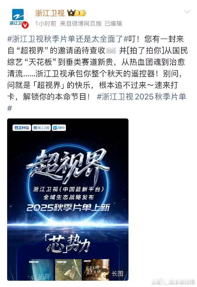 8岁到80岁的综艺全有了 刚跟朋友聊秋季综艺,说到浙江卫视的片单我俩都激动了!不仅有《王牌对王牌》这种快乐老家,还搞了《无限超越班》的演技对决,连“代际跨屏”新赛道都敢试,选择太多真的会纠结该先追哪个!