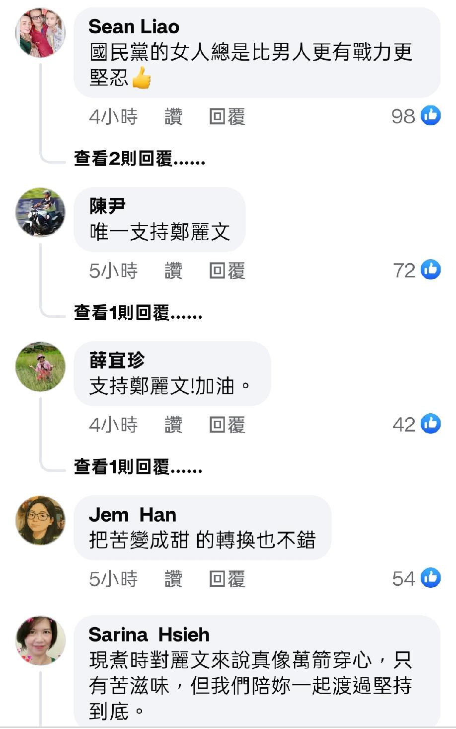 拖到快尾声了,才来拜访我们柱姐。柱姐大方送了郑丽文一盒小点心,分享一路上的心酸,还语重心长的送给郑丽文“宠辱不惊”四个字。 台湾网友说的直接 洪秀柱到郑丽文,相比朱立伦,赵少康到郝龙彬其他男性,更看好女性。 女性比男性更有战斗力