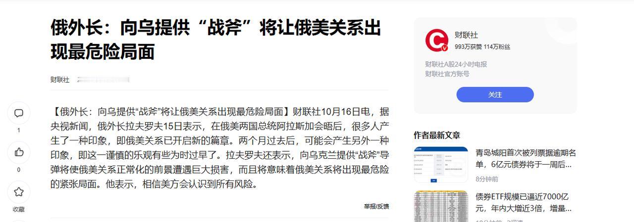 俄罗斯外长正式宣布 10月16日,俄外长拉夫罗夫15日表示,在俄美两国总统阿拉斯加会晤后,很多人产生了一种印象,即俄美关系已开启新的篇章。两个月过去后,可能会产生另外一种印象,即这一谨慎的乐观有些为时过早了。 阿拉斯加会晤时那点微弱的暖意,在“战斧”导弹的阴影下正迅速冻结。当时特朗普和普京坐在一起谈笑风生,外界都传 “俄美关系要开启新篇章了”。 可谁都没往深了想,这种没有实质共识的会面,顶多算是表面上的 “不翻脸”。拉夫罗夫现在说乐观为时过早,那都是客气话 —— 从美国后来的所作所为看,他们压根就没打算真缓和关系。 真正让局势变僵的,就是那该死的 “战斧” 巡航导弹。这玩意儿可不是普通武器,最大射程能超 2000 公里,从乌克兰境内一发射,俄罗斯首都莫斯科都在打击范围内,战斗部足足 450 公斤,比乌克兰现在用的无人机威力大多了,一两枚命中就能造成毁灭性破坏。 之前泽连斯基求了好几次,拜登政府都没敢答应,现在特朗普却把这事儿摆上了台面,17 号还要和泽连斯基专门谈,这明摆着是往俄罗斯心口上捅刀子。 拉夫罗夫说这会 “巨大损害” 俄美关系,这话里的分量可比普通警告重多了,简直就是在白宫门前划了道生死线。 俄罗斯为啥反应这么激烈?想想 2018 年叙利亚战场就知道了,当时美军发射的 “战斧” 导弹,被俄军的 S-400 防空系统拦下来过,可那是在叙利亚,离俄罗斯本土远着呢。 现在要是把这导弹送到乌克兰手里,等于把枪口直接顶在了俄罗斯脑门上,莫斯科周边都已经部署了 S-400、S-500 防空系统,这架势就是真要打 “莫斯科保卫战” 了。 更让人揪心的是,“战斧” 还能装核弹头。俄总统新闻秘书佩斯科夫早就说了,要是真到那一步,局势就 “严重升级” 了。这可不是吓唬人,俄罗斯的核威慑政策写得明明白白,本土要是遭了生存性威胁,连战术核武器都可能用。 特朗普自己也承认给 “战斧” 会让局势升级,可他还在那儿摇摆不定,一会儿说 “基本决定” 要给,一会儿又叹着气说 “对普京失望”,说白了就是把这导弹当施压的筹码,根本不管会不会引爆更大的冲突。 美国这算盘打得精,可代价是把全世界都拖进危险里。截至 10 月,美国给乌克兰的援助都超 1100 亿美元了,国内老百姓怨声载道,特朗普一边要拿对乌强硬讨好部分选民,一边又怕局势失控丢了中间选票,才搞出这反复无常的戏码。 9 月 23 号还骂俄罗斯是 “纸老虎”,10 月 12 号就放狠话要送导弹,15 号又突然缓和语气,这变脸速度比翻书还快,哪有半分真心想解决问题的样子? 俄罗斯也不是软柿子,最近已经和古巴签了军事合作协议,暗示可能要在古巴部署导弹,那可是当年古巴导弹危机的老地方,这意思再明白不过:你敢动我的底线,我就敢戳你的痛处。 普京还特意提了《新削减战略核武器条约》,想把 “战斧” 问题和核军控绑在一起谈,可特朗普政府压根不接话,这不就是逼着俄罗斯往更激进的方向走吗? 最让人寒心的是,俄方其实一直想谈。之前提议提高俄乌谈判的级别,分人道主义、军事、政治三个小组好好聊,可乌克兰连理都不理,背后还不是有美国撑腰? 拉夫罗夫说得对,欧洲巴不得把这场战争变成 “特朗普的战争”,乌克兰也想把美国绑在自己战车上,这么一搅和,俄美关系还怎么正常化? 现在再回头看阿拉斯加会晤那点 “暖意”,简直就是个笑话。没有实际的互信基础,没有明确的合作共识,全靠场面话撑着,一旦碰到 “战斧” 这种触及核心利益的问题,立马就现了原形。 拉夫罗夫划下的这道红线,不只是给美国看的,也是给全世界看的:别把俄罗斯的克制当软弱,真把导弹送过去,那就不是俄乌冲突的事儿了,是俄美直接的对抗。 说句实在的,中老年人都经历过冷战,知道大国掰手腕的危险。当年古巴导弹危机差一点就引发核战争,现在 “战斧” 导弹要是真进了乌克兰,说不定比当年还危险。 美国要是真不管不顾跨了这条线,俄美关系就不是 “巨大损害” 那么简单了,恐怕得退回冷战最紧张的年代,甚至更糟。 拉夫罗夫的话算是给所有人敲了警钟:别再幻想什么 “新篇章” 了,美国不收起递向乌克兰的导弹,俄美关系就只能在冰点下越陷越深。 这道红线能不能守住,不仅关乎俄美两国,更关乎全世界的安危,但愿美国能早点清醒,别真把事情闹到无法收拾的地步。