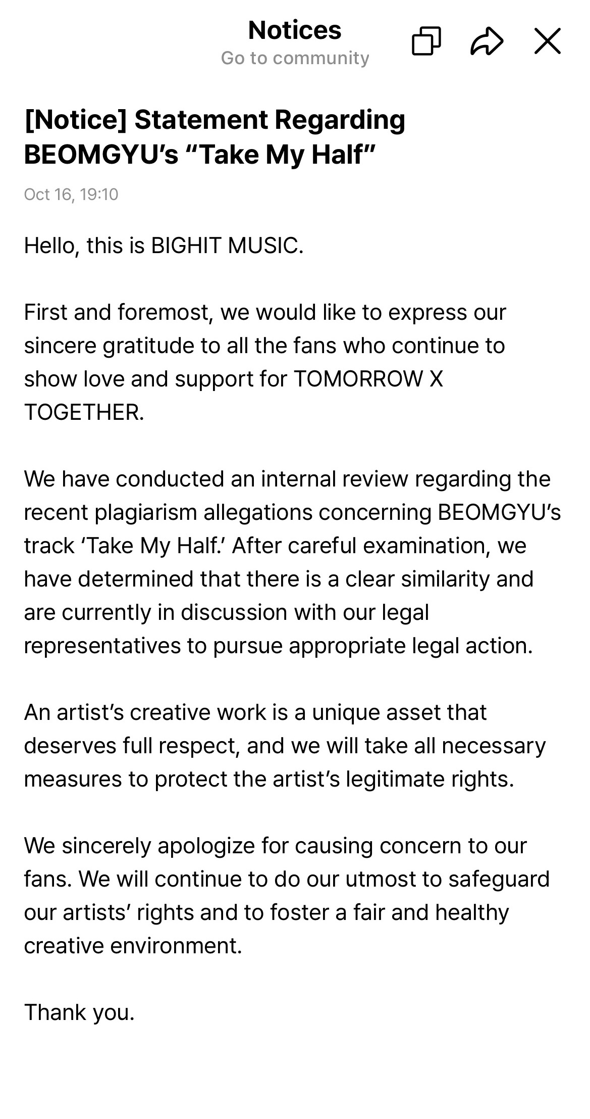 崔杋圭自作曲被抄袭公司回应:确认有明显的相似性,正在讨论法律应对措施。
