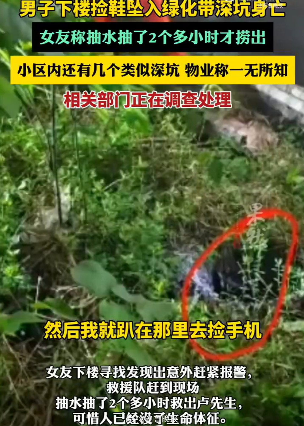 #小区致命陷阱为何出了人命才发现#【晚报来论 | 居民楼下坠坑身亡,致命“陷阱”为啥没有早发现】#小区藏致命深坑物业为何一直无作为# 只因下楼捡了一次鞋,竟遭遇了一场灭顶之灾。近日,重庆市江津区双岛湖御园小区发生了这样一场悲剧:卢先生到小区楼下捡掉落的鞋子时,掉进了隐藏在绿化带中的一个积水深坑。等救援人员抽水两个多小时救出卢先生时,他已经没有了生命体征。