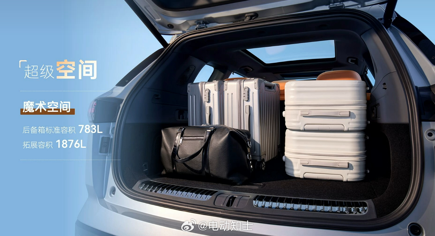 后备箱容积783L,放倒后排后容积扩展到1876L。