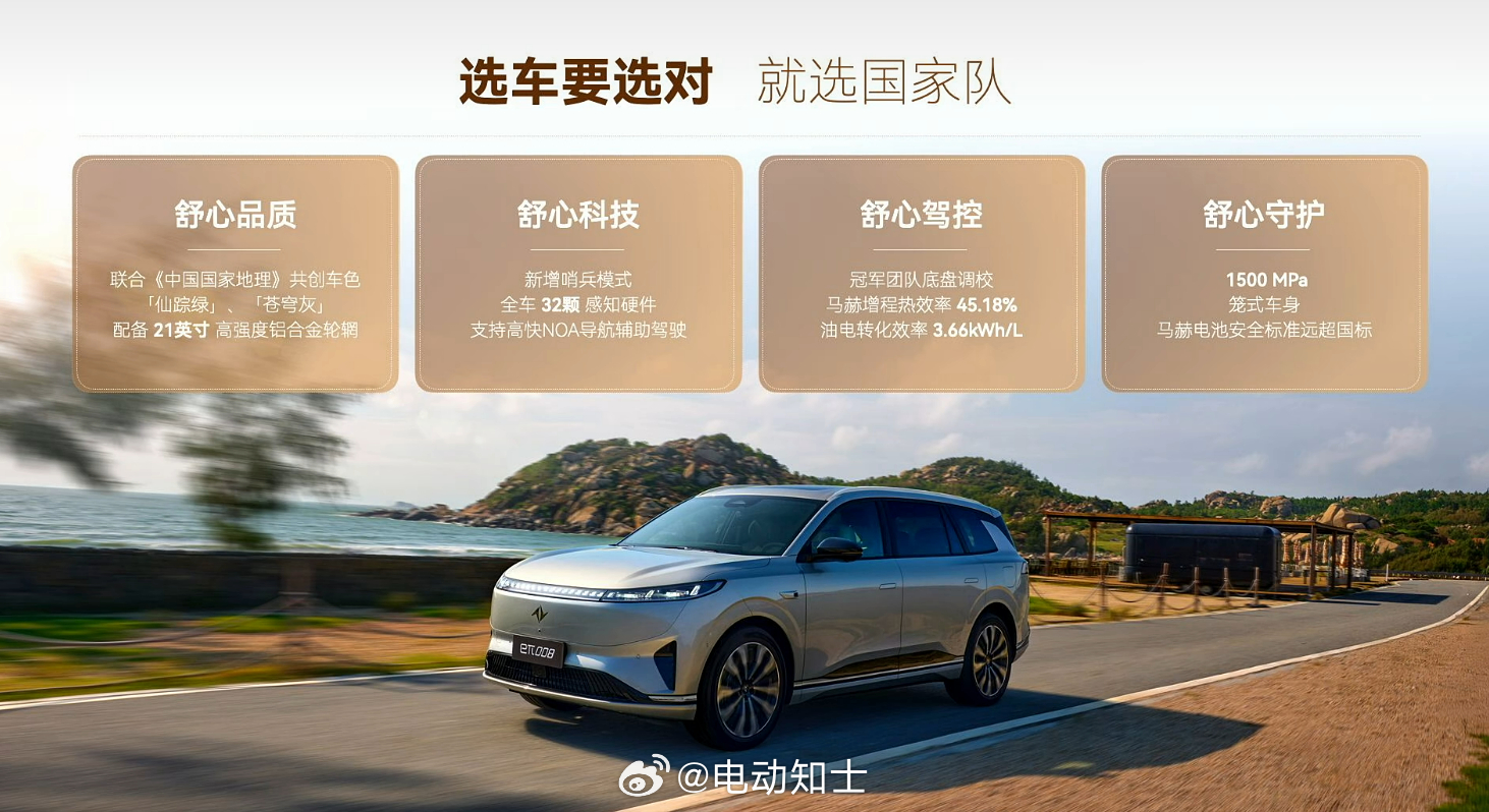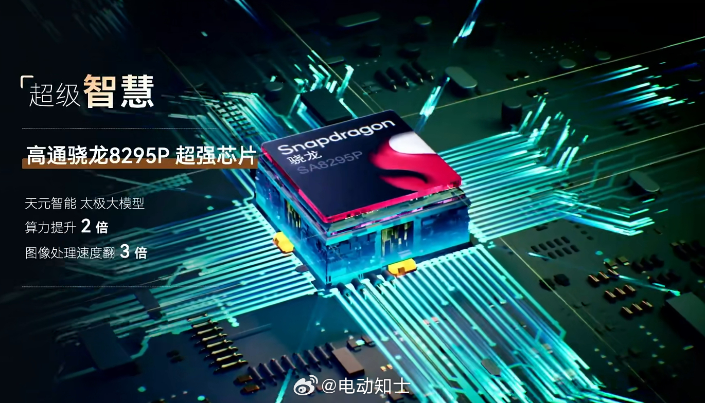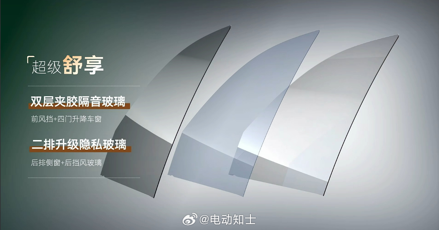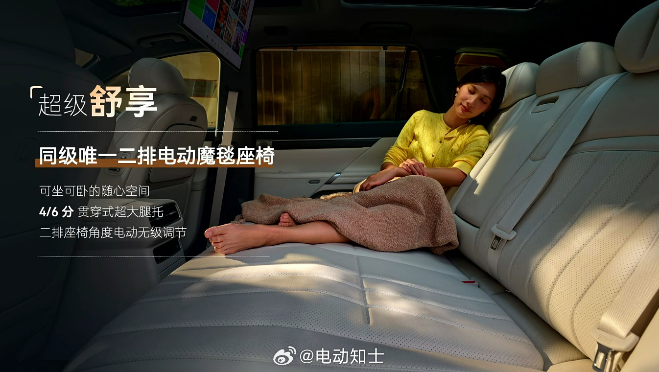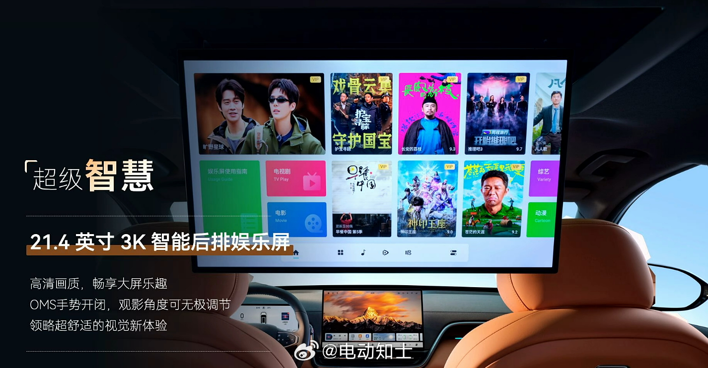 标配前后排全景玻璃、双层夹胶玻璃,升级高通骁龙8295P车机芯片+双AI大模型语音座舱,增加腾讯视频、B站、QQ音乐等,后排升级为21.4英寸3K智能后排娱乐屏。