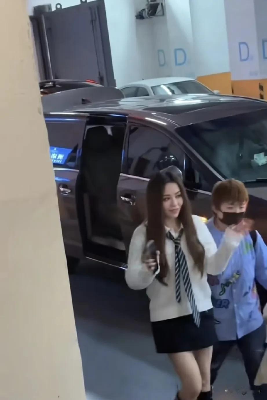 停车场光影交错,张靓颖身着学院风搭配,发丝随步轻扬