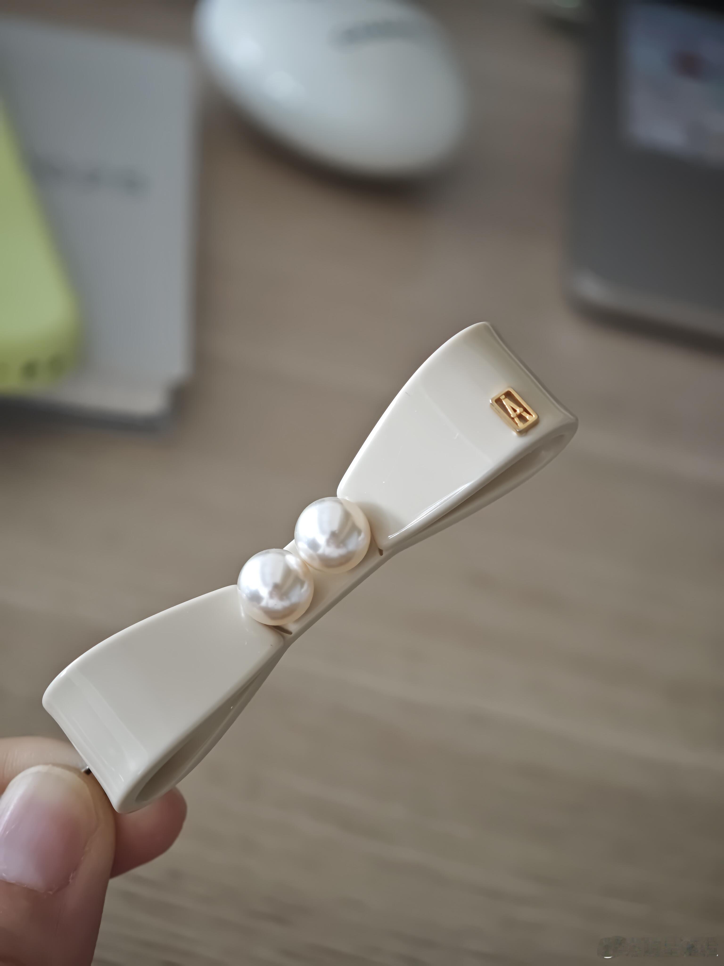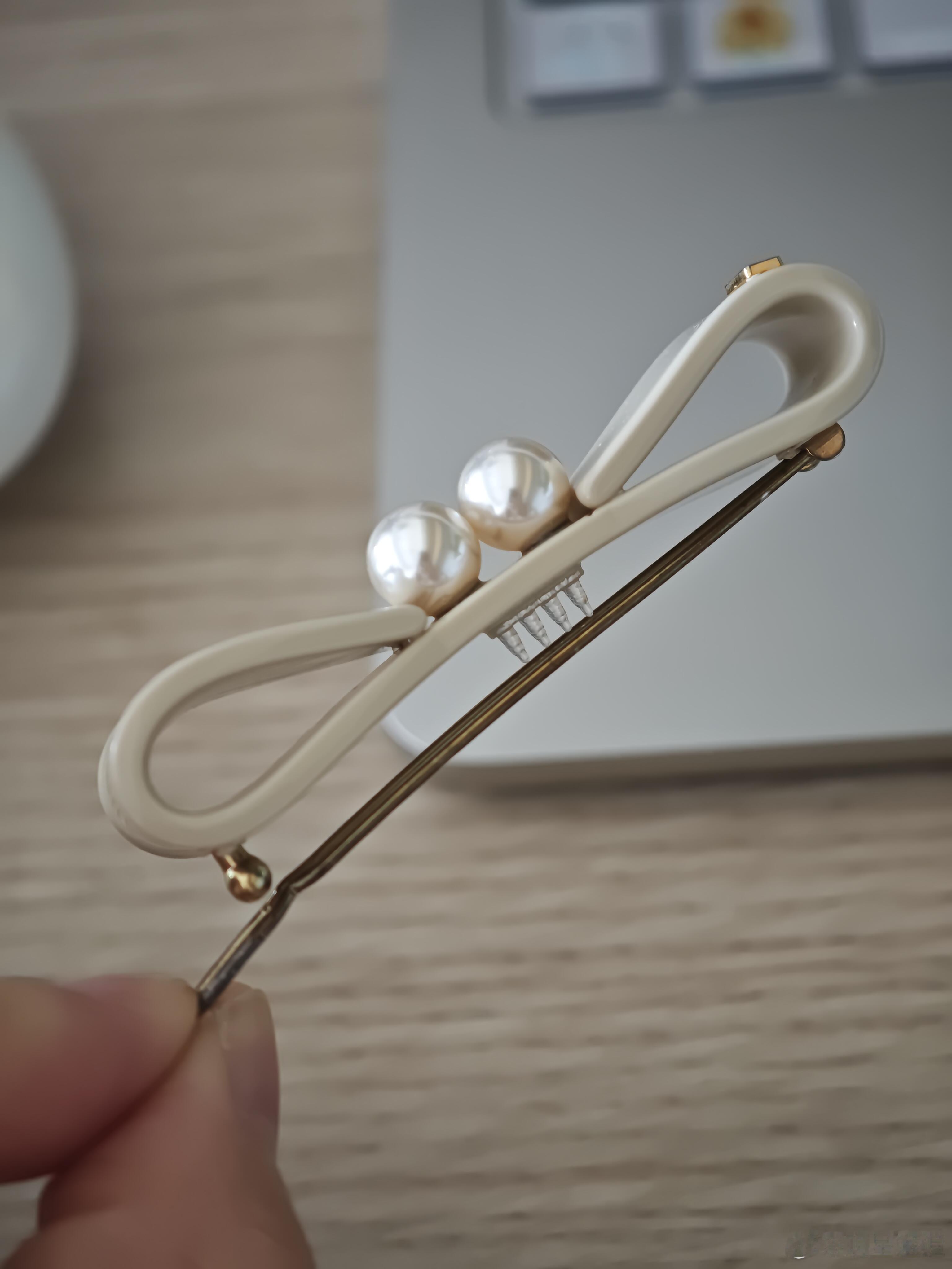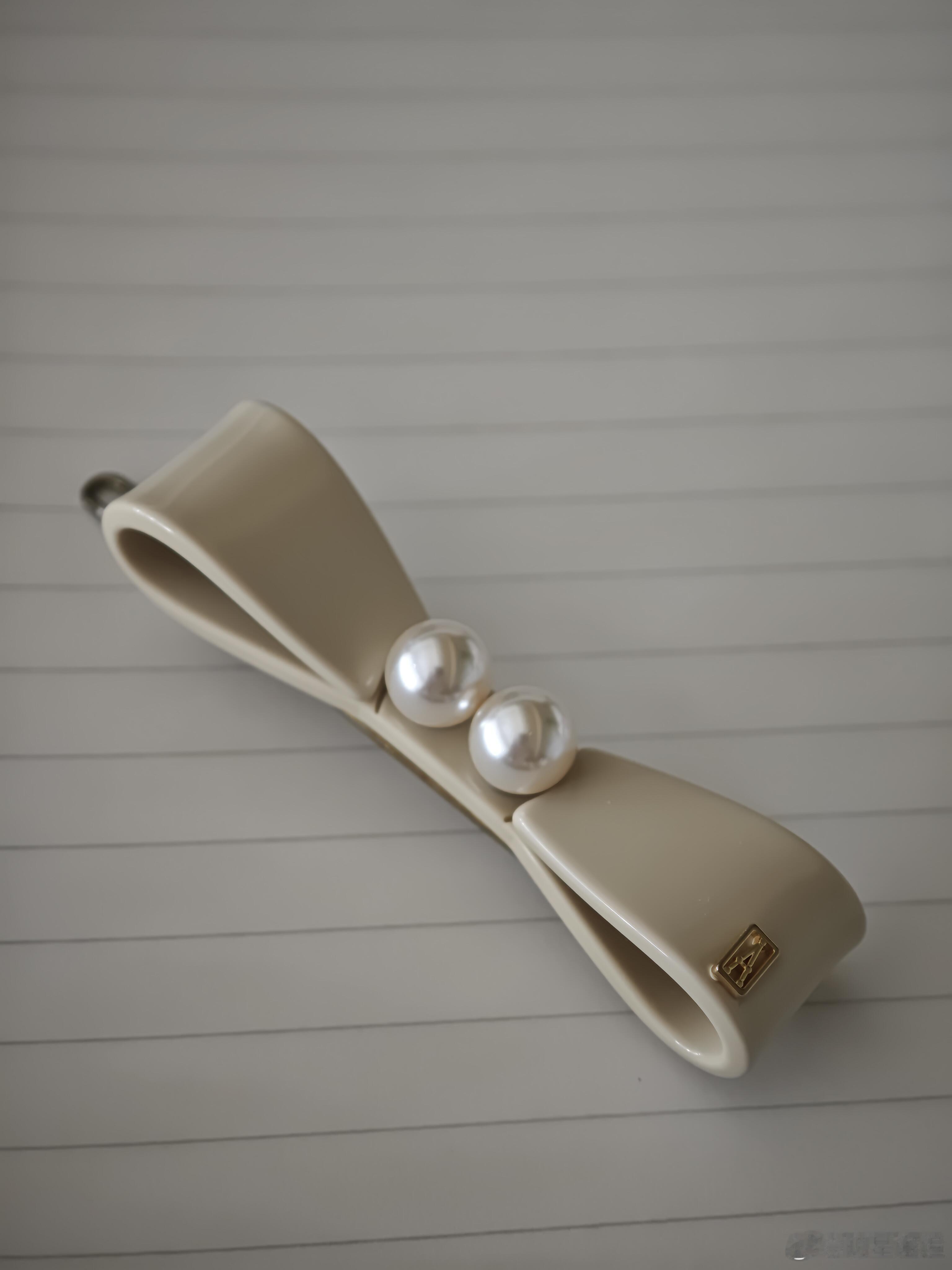 这是一款设计优雅的米白色蝴蝶结造型发夹。其主体呈流畅弧形,表面带有细腻质感,两颗圆润的珍珠点缀其上,散发着温润柔和的光泽,更添一份典雅气质。金属夹子部分采用金色镀层,做工精致,与米白色主体相得益彰。整体设计简约而不失精巧,将复古的蝴蝶结元素与温婉的珍珠巧妙结合,无论是日常佩戴还是搭配裙装,都能轻松提升发型质感,尽显温柔淑女风范。时尚配饰