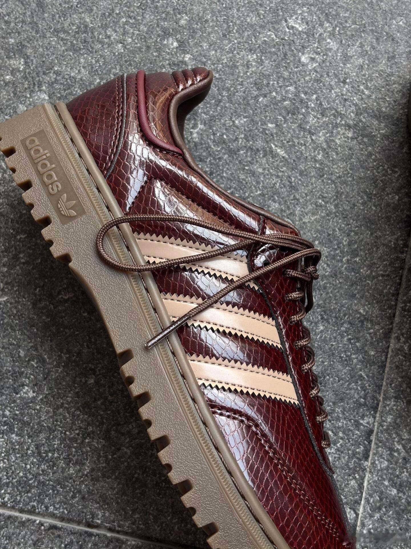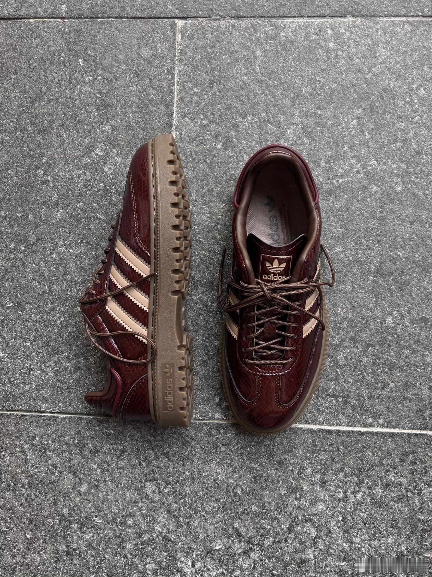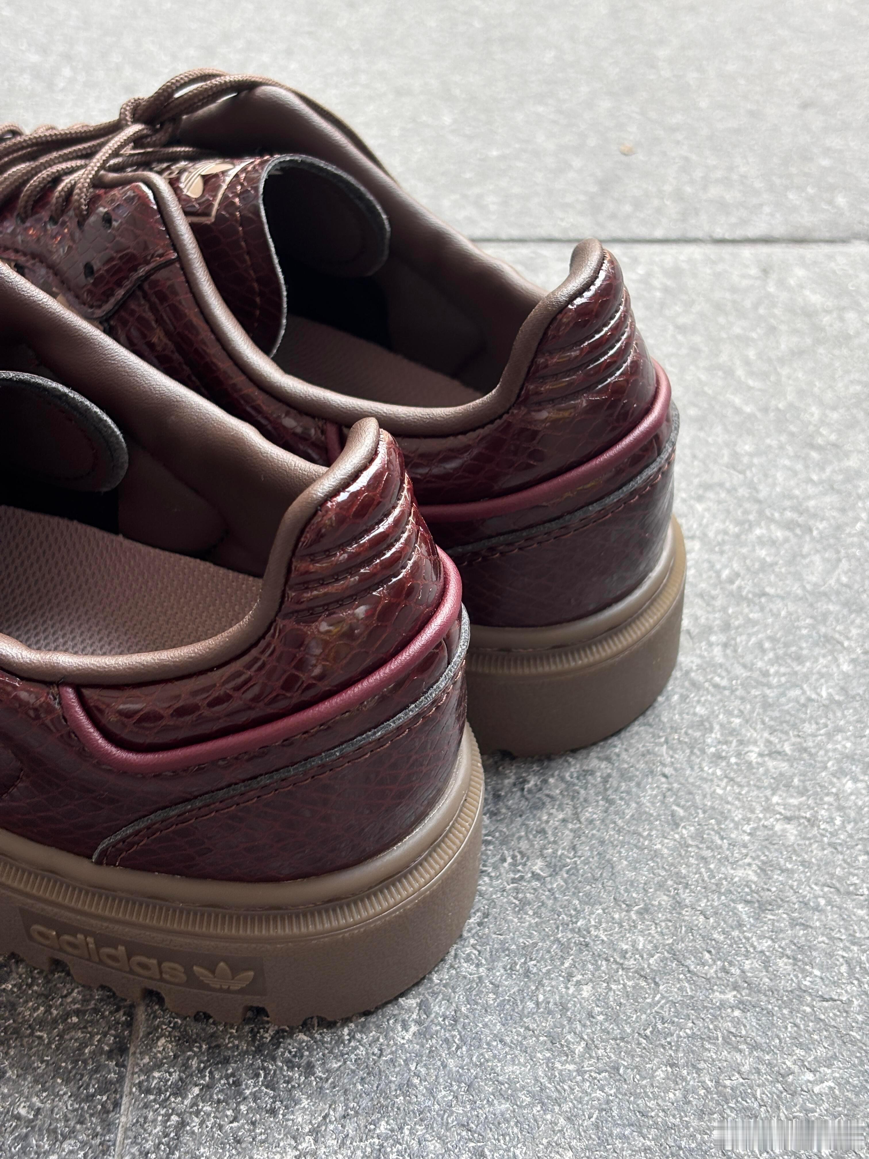这双阿迪达斯运动鞋以质感出众的酒红色蛇纹皮革鞋面为特色,侧边饰有经典的米白色三条