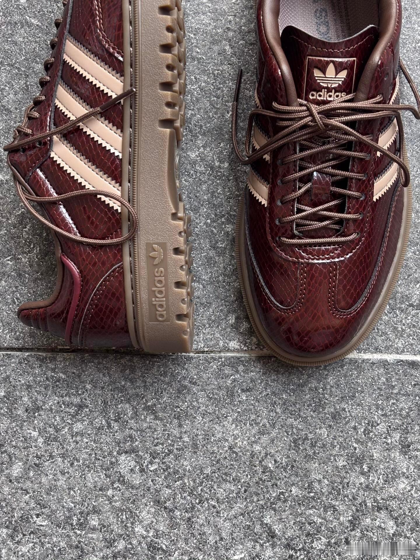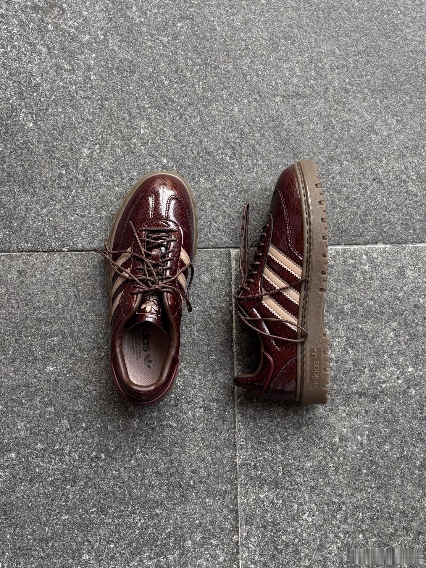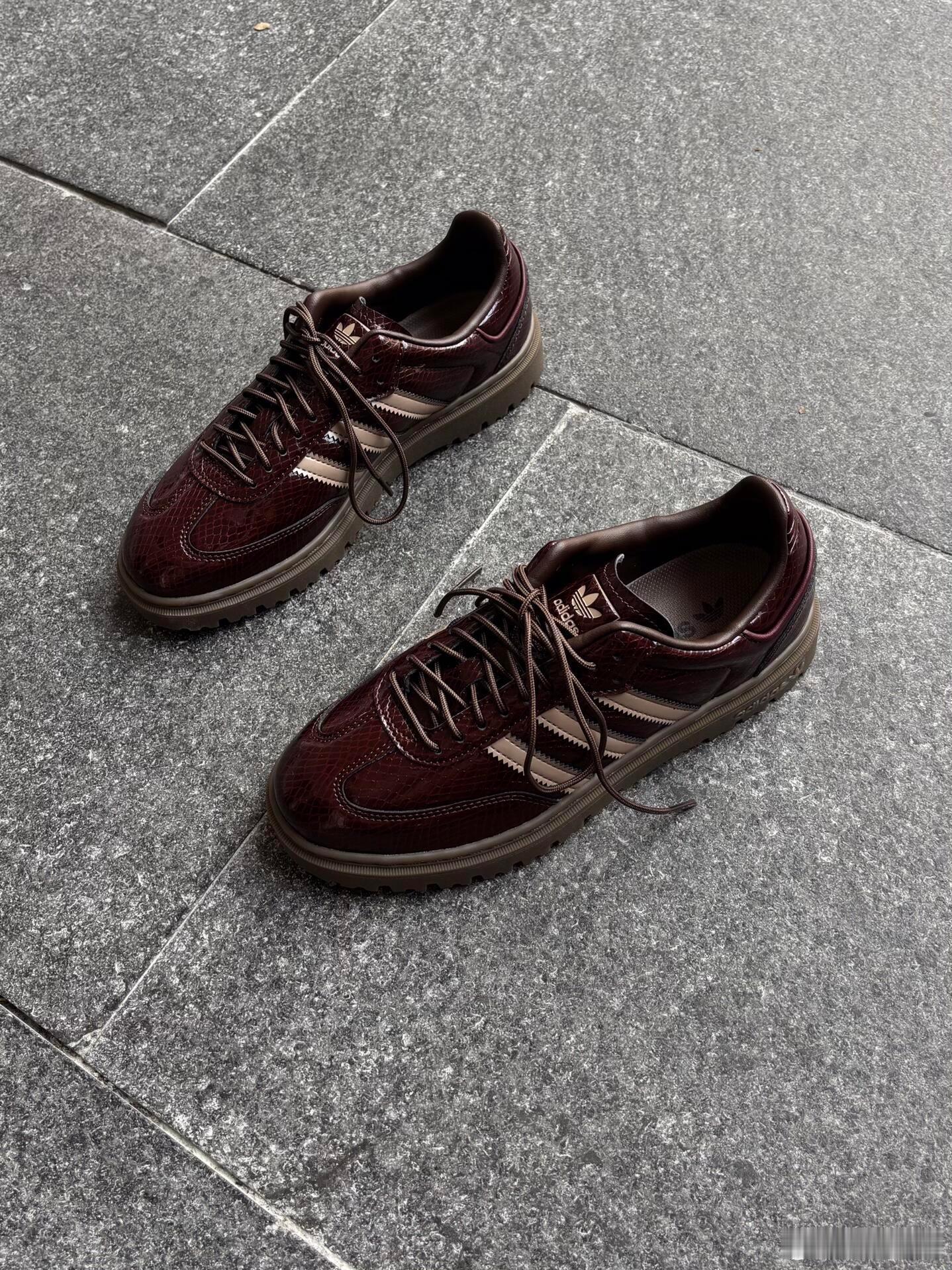 这双阿迪达斯运动鞋以质感出众的酒红色蛇纹皮革鞋面为特色,侧边饰有经典的米白色三条