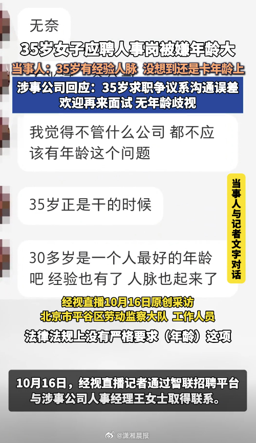 #拒绝录用35岁女子企业去年0人参保#【#揭秘拒绝录用35岁女子涉事企业#】据媒体报道,北京一名35岁女子在应聘人事岗位时,被北京铭隆九洲科技HR以“年龄大”为由拒绝。涉事公司起初解释“不确定老板能否接受35岁”,后改口称“39岁也可接受”,否认存在歧视。对此,官方工作人员回应:企业设置岗位年龄限制,属于单位自主经营权范畴,目前法律法规未作硬性禁止。#35岁女子应聘人事岗被HR嫌年龄大#