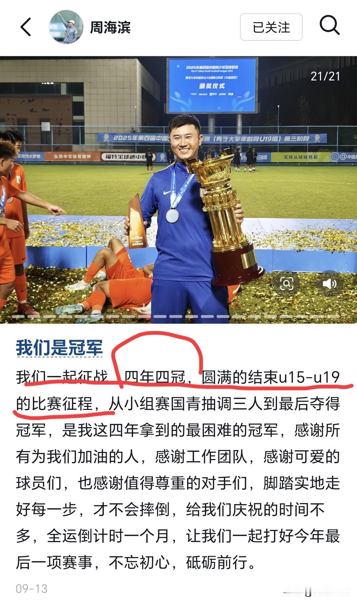 为什么不是董路?!前国脚周海滨,将正式出任U15国足主教练[击掌] 北京时间10月17日,据“直播吧”独家消息,U15国足新任主教练选聘工作已经告一段落,不出意外的话,前国脚周海滨将出任U15国足的主教练 2022年,周海滨担任山东泰山U15队主教练。同年11月,带队拿下第一届中青赛(U15组)冠军,就此开启了执教的冠军之旅[赞] 四年四冠!这是周海滨作为主教练,给山东球迷交出的完美答卷,从U15到U19,这四个全国冠军的含金量可为十足[击掌] 当然,中国足协对于周海滨的执教能力,也是看在眼里,高度认可,因此,本次U15国足主教练的选聘,其他报名者对于帅位的竞争,几乎可以忽略不计了,周海滨是纯靠实力,纯靠成绩征服了足协选帅组,周海滨出任U15国足主教练可谓是众望所归[奋斗] 弱弱的问一句,U15国足选聘主教练,董路报没报名?这样的机会,董路为什么不抓住呢[what] 估计此时此刻,董路可能会五味杂陈,不知道他当年硬怼周海滨的视频,董路还有没有存货,如果没有的话,各位球迷大神,可以帮助董路回忆一下[惊呆]