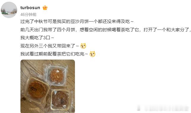 孙俪过完了中秋没来得及吃月饼孙俪过完了中秋还没吃月饼孙俪中秋后没来得及吃豆沙月饼,带出门的四个只吃 3 口,剩下三个带回,打算配茶吃到过期前。
