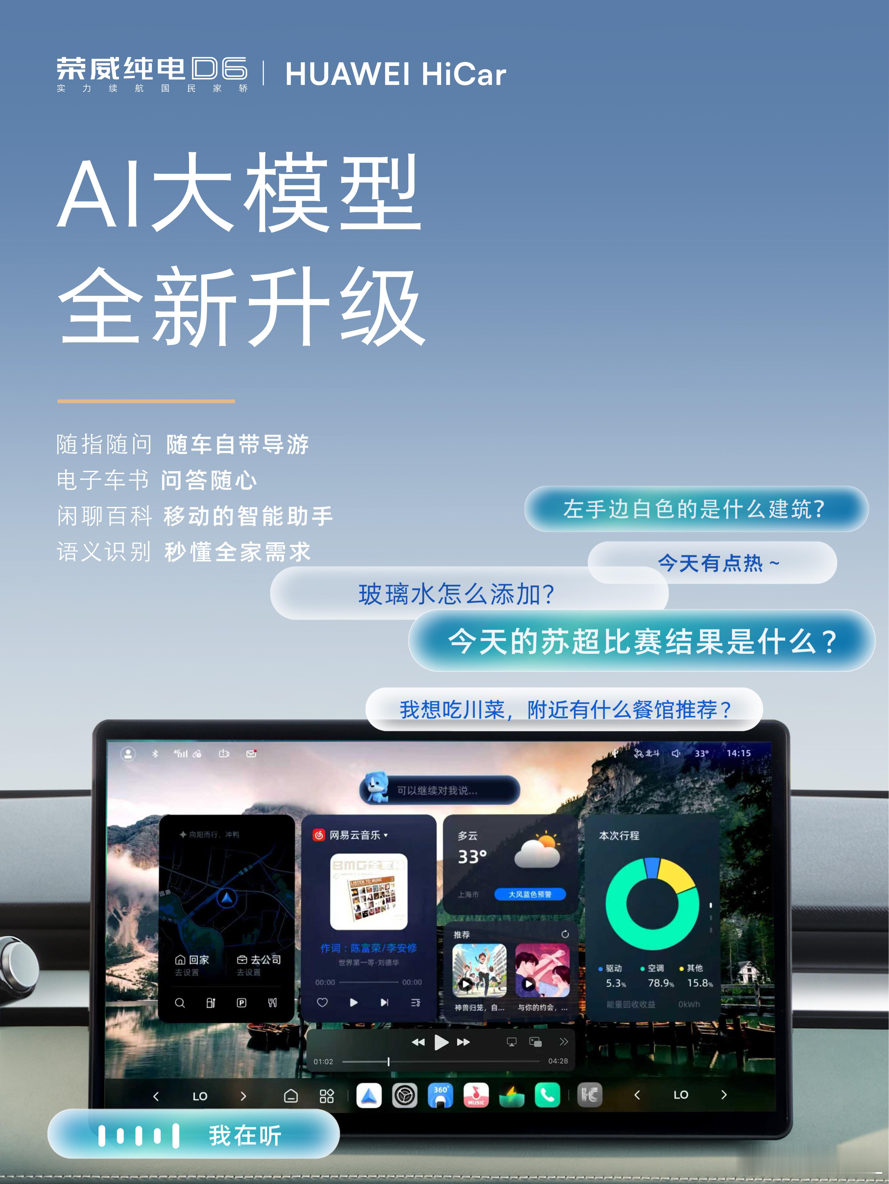 今天,荣威纯电D6OTA全面推送,全系搭载HUAWEIHiCar与AI大模型