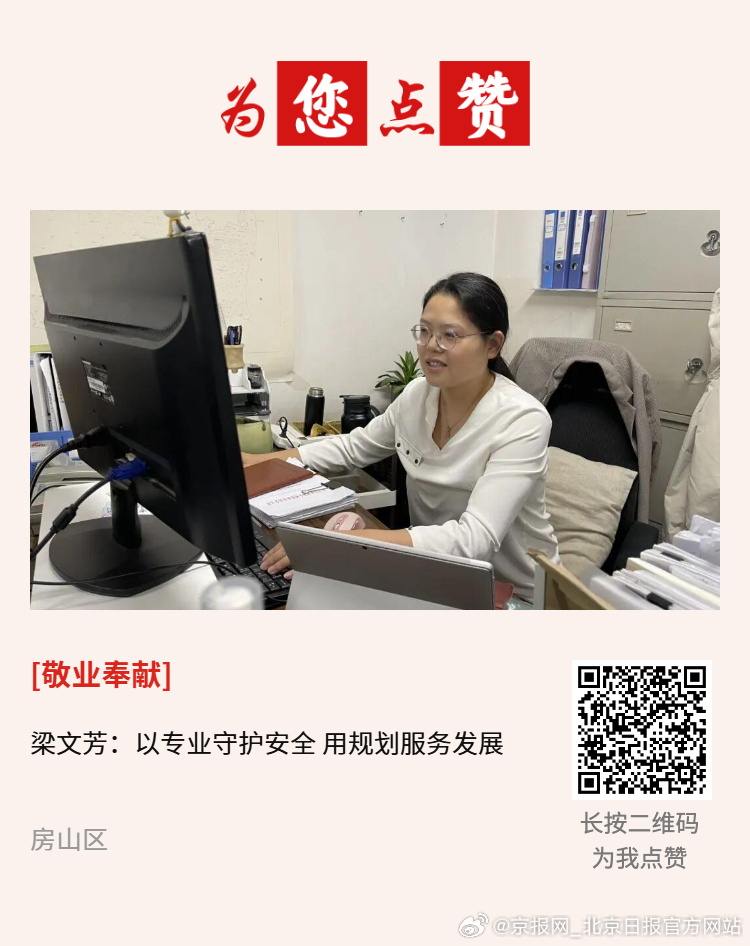 #为您点赞#【梁文芳:以专业守护安全 用规划服务发展】市规自委房山分局副科长梁文芳,以党员初心和规划师严谨深耕一线:为守安全,带团队调研,在史家营乡选址中优化7版方案、核查38个地块;为促进发展,推动补充139万㎡发展空间,参与两横三纵道路及生命线规划,整合资源助山区发展;2023年创新选址五步,筛选63处民生安置宅基地,49块关键地块已获批。#您的光我来传#