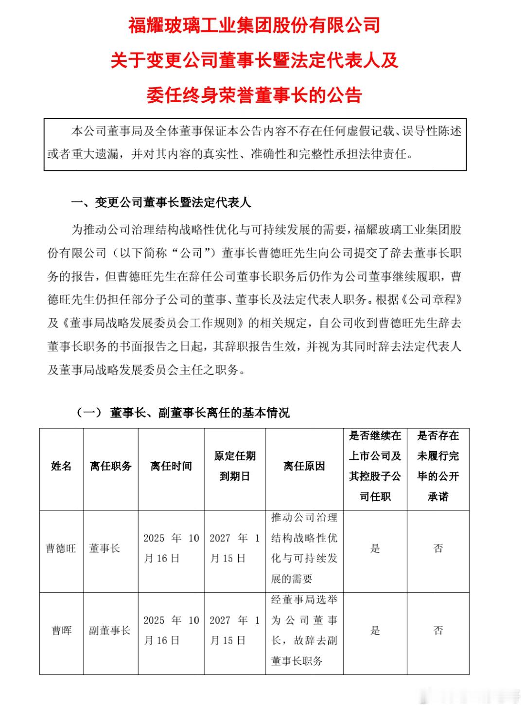 曹德旺辞去董事长职务,选举曹晖为新董事长​​​