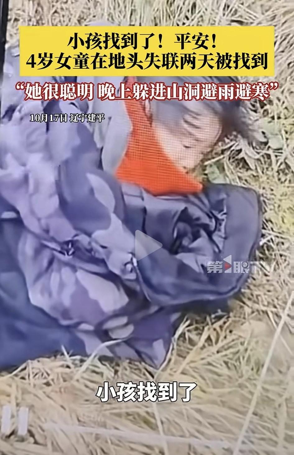 10月17日,辽宁4岁失踪女童已找到!目前平安,现场人员也表示,女孩生命体征平稳,没有太大问题,能叫爷爷奶奶。 事情起因,10月15日,辽宁朝阳建平县,一名4岁女童和爷爷奶奶到地里秋收时,在地头的面包车内睡着了,而爷爷差不多干了二十多分钟的活后,折回面包车里就发现孩子失踪,走失前孩子身着红色上衣。 而当地为了及时找到孩子,不但没日没夜的搜救,更是直接出动了无人机、搜救队、搜救犬,参与救援人数最多时有上千人! 此前就村民担心,孩子是不是被老鹰抓走,如果真是那就凶多吉少了。而就在大家都无比担心之时,一架无人机在雨夜中锁定了一个山洞,后搜救人员赶到发现,果然是失踪的女孩! 更让大伙庆幸的是,女孩虽然有点虚弱,可此时的她意识清楚,身体也并无大碍,一切平安!据知情人透露,女孩是不慎失足掉进了大沟里,而女孩很聪明,晚上下雨时,她自救的躲进了山洞里避雨。 太好了!看到孩子被找到那一刻,让人悬着的心一下子掉下来了。真的要感谢所有搜救孩子的人员,是你们不辞辛苦日夜奋战找到孩子,向搜救人员致敬!你们辛苦了!感谢! 此事也警惕大伙,带娃要谨慎,最后别让孩子离开大人的视线!