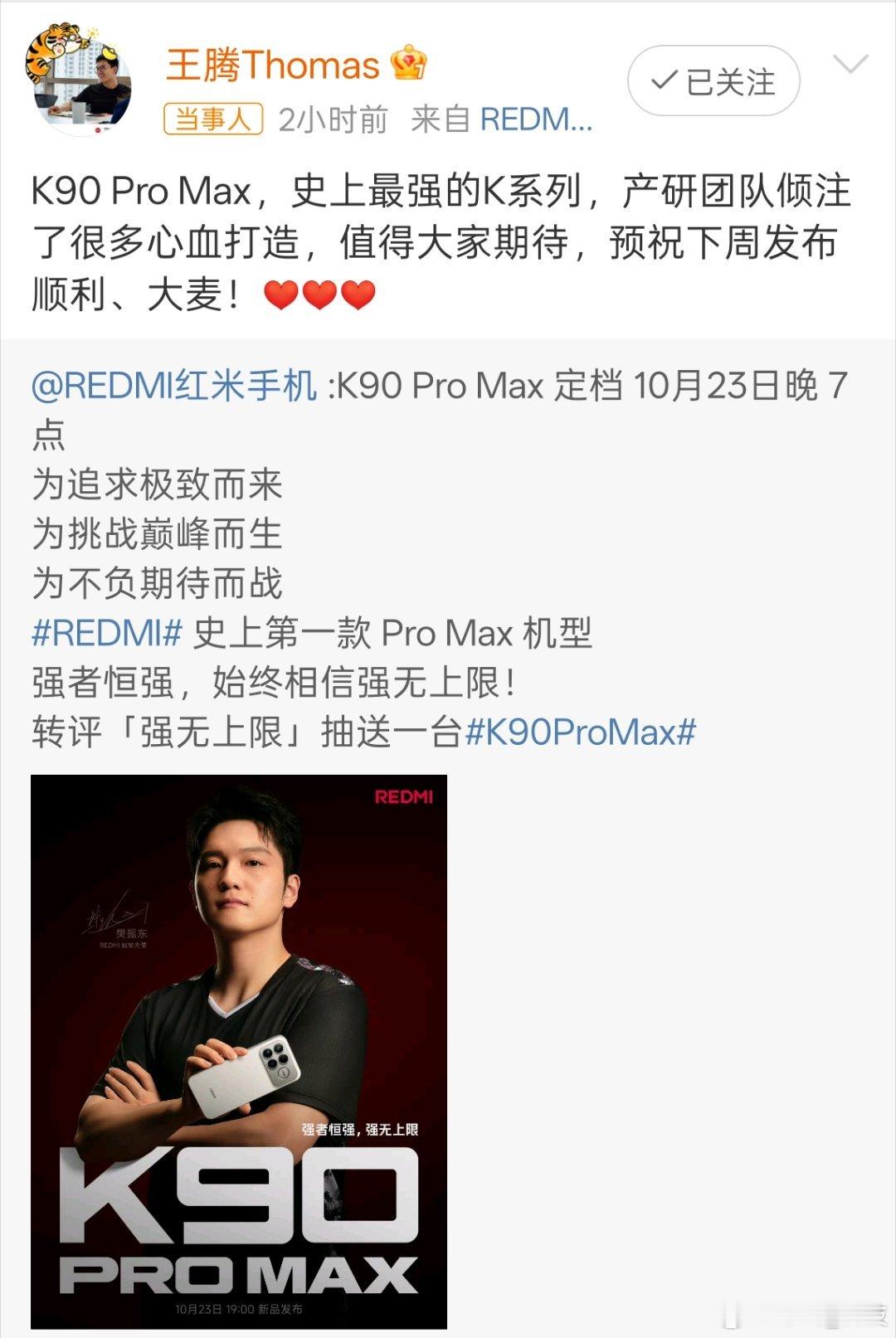 王腾宣传K90ProMax 情义依然在王腾回应红米新手机是遗作史上最强K系列,产研团队倾注很多心血打造的产品,值得期待。